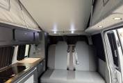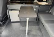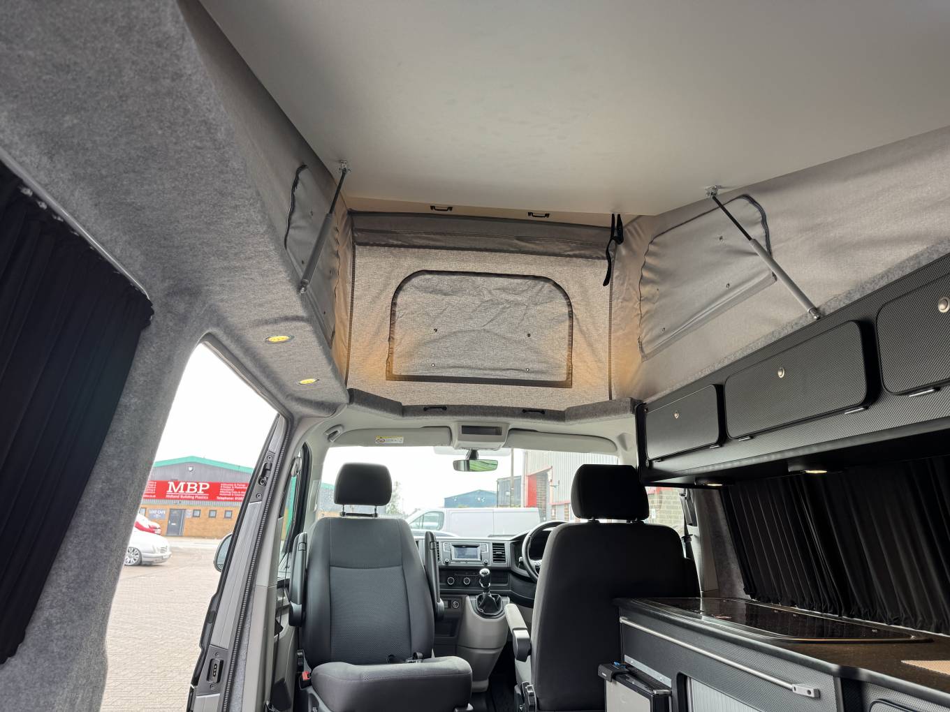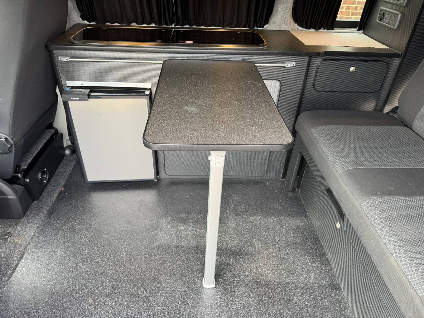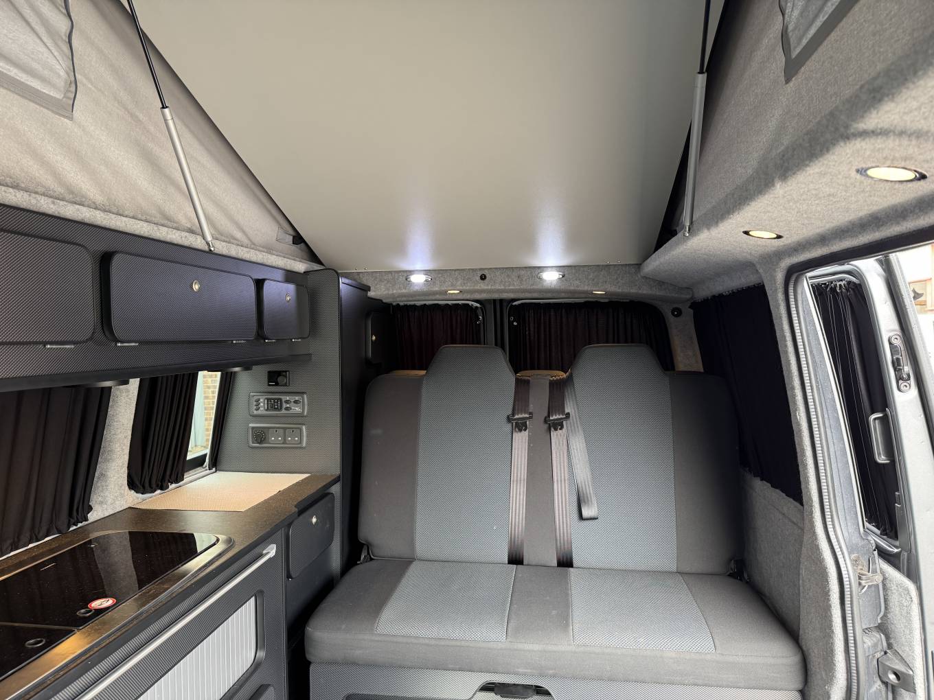 Inside, the van features a premium Camper King conversion with a pop-top roof that provides an additional sleeping area, along with a rock and roll bed that comfortably sleeps two adults. The layout is both functional and stylish, with a fully fitted kitchen that includes a two-burner gas hob, sink with running water and a fridge with freezer compartment. There are onboard fresh and waste water tanks, solar panel and leisure battery with split charge system and 240V hook-up, as well as integrated LED lighting and plenty of storage space throughout.