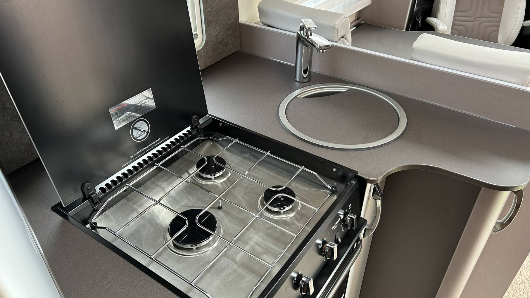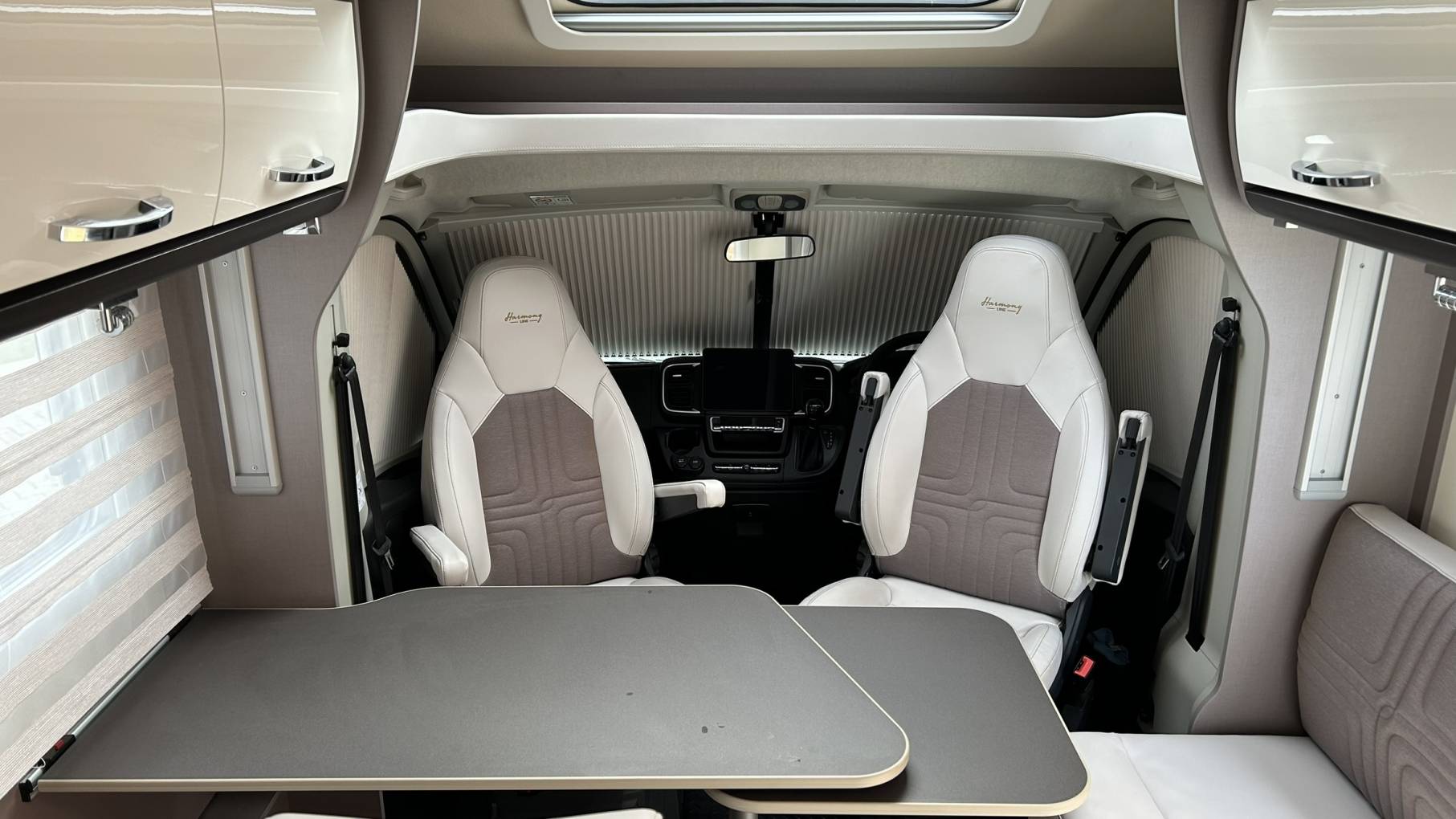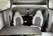 To the front of the van you will find 2 swivel seats and a dinette creating a comfortable dining/entertaining space. The forward facing bench seat has a further 2 seatbelts. Above this area is a further electronic drop down double bed.