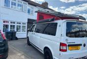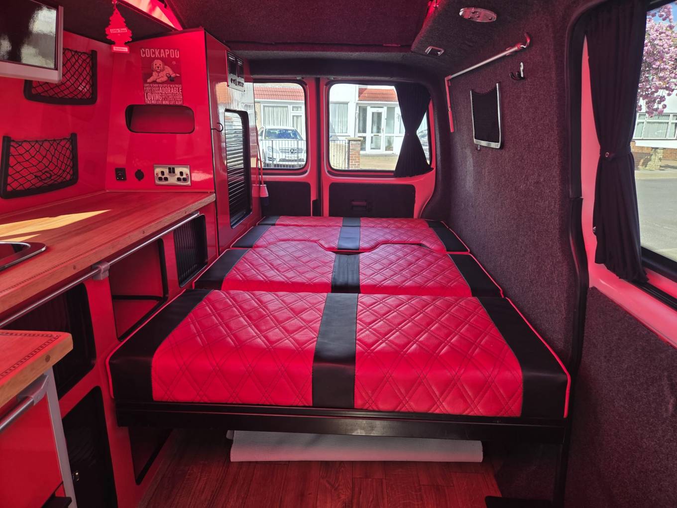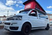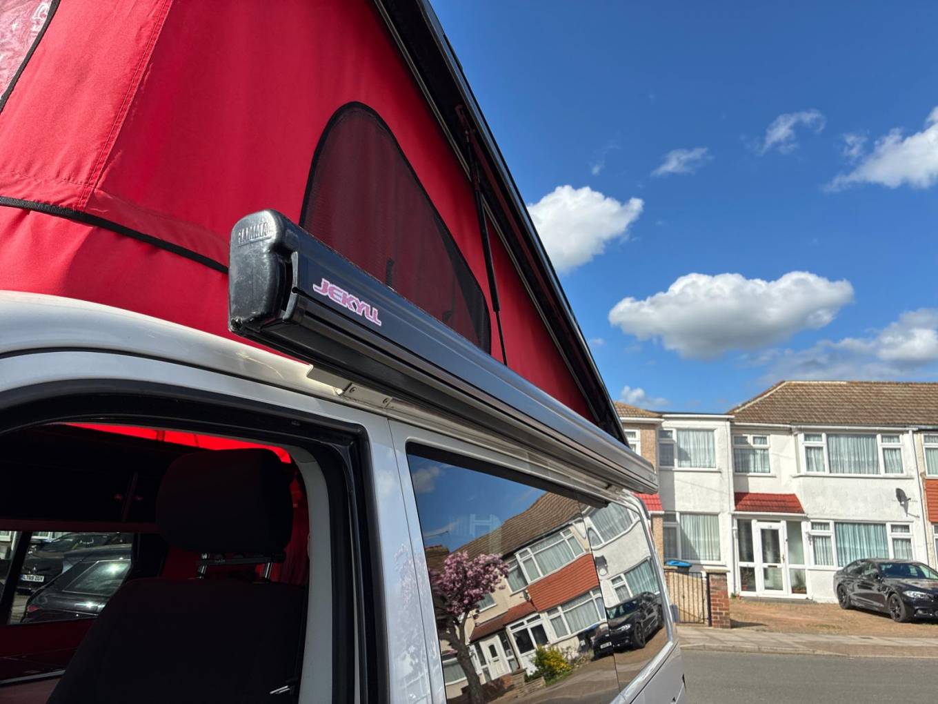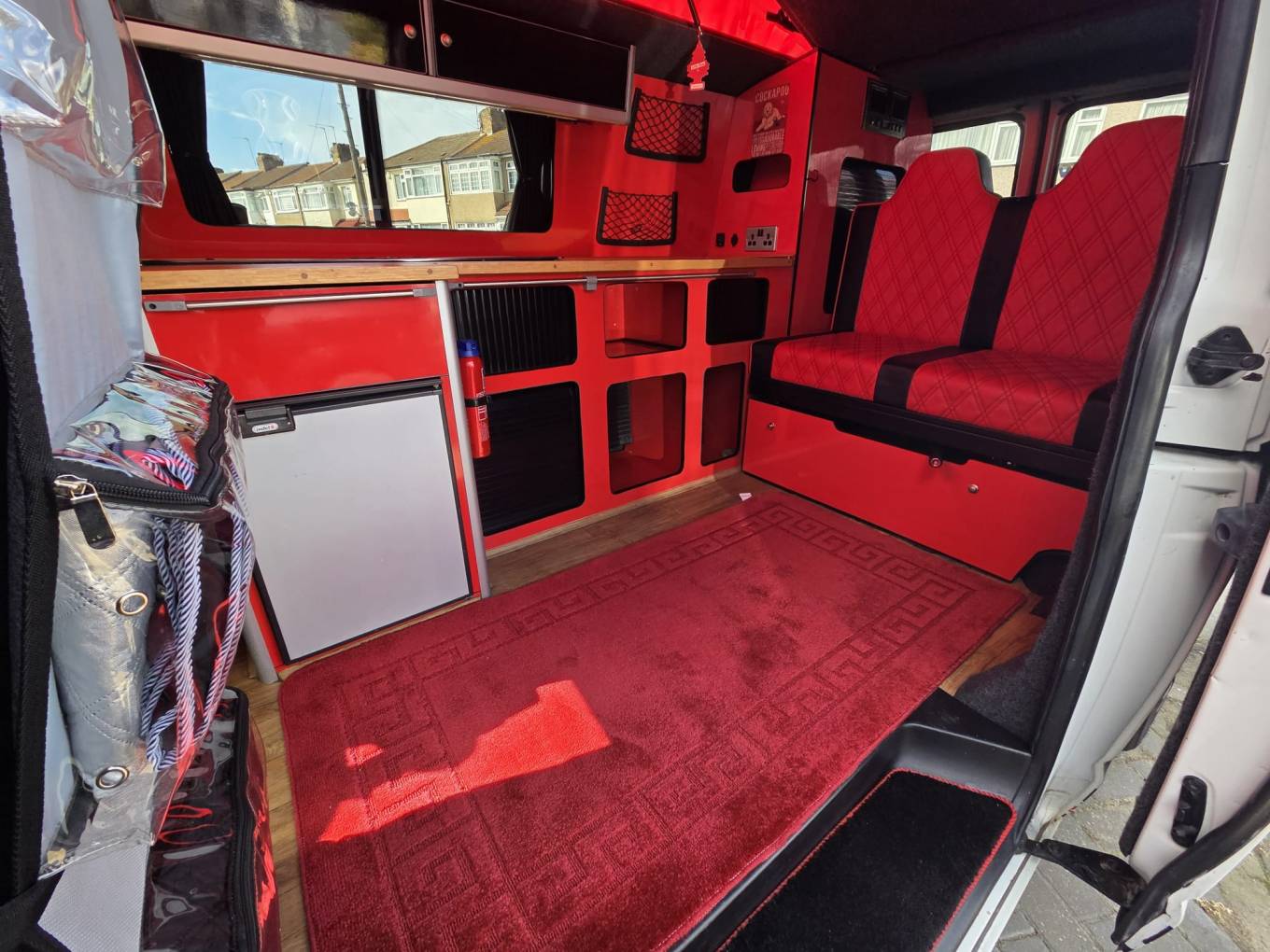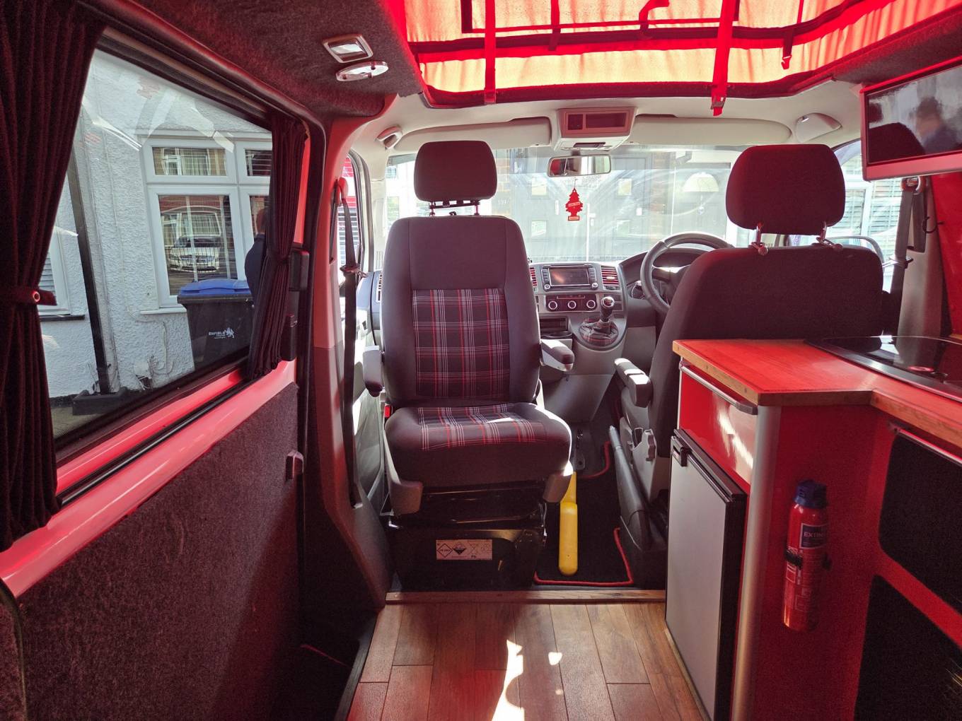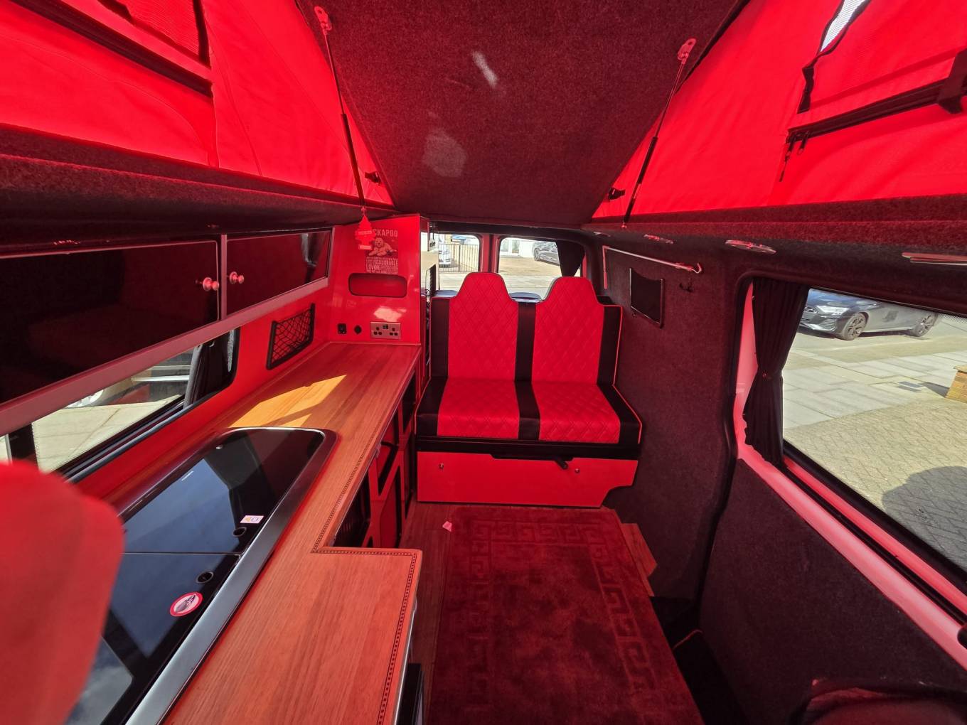 MOTORHOME DEPOT RICHMOND-UPON-THAMES are pleased to bring to you this 4 berth 2014 VW Transporter 2.0 TDI T32 Highline LWB | 69,645 miles | New MOT - March 2027 | Cambelt changed Jan 2023 at under 65,000 miles | exterior BBQ point | reversing sensors | Cubo Breeze V2 air awning included along with awning carpet & groundsheet | rock n roll bed | Bluetooth radio | underslung refillable LPG gas | cab air conditioning | solar panel (not tested) | alarm | diesel heater (to be connected as not used by current owner) | Fiamma F45s wind-out canopy | tow bar | new clutch Easter 2025 | eye-catching & striking red/black interior | natural wooden worksurface | mid woodgrain flooring/red mat included | 1 x swivel seat | fridge with small freezer compartment | 2 x ring gas burner - smoked glass lid over | sink with cold water tap - smoked glass lid over | a number of accessories to be included with sale to get you on the road to make your memories - cool box - radiator - gas Cadac/BBQ - camping folding wardrobe/storage - collapsible kitchenette - wind breaker | 4 x sets of keys | steering lock