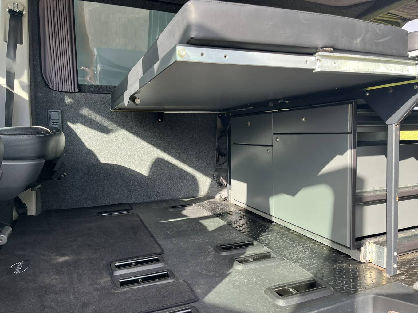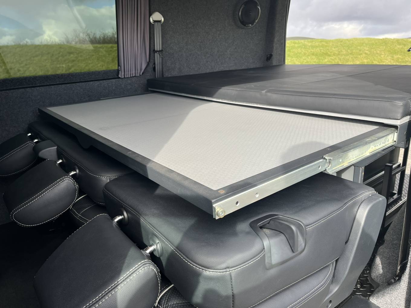 Exploria rear bed conversion, full width which extends forwards over the folded centre row.
