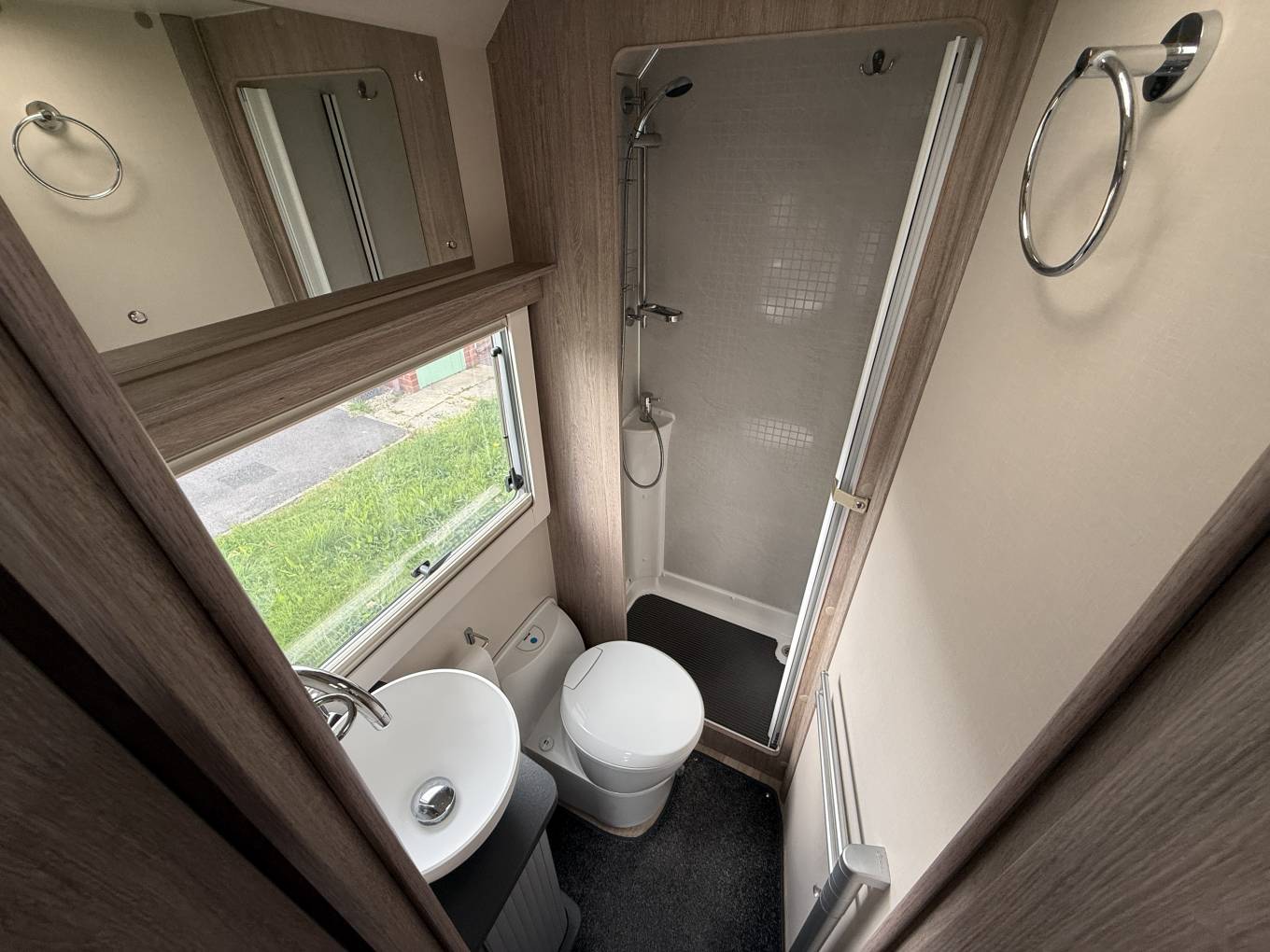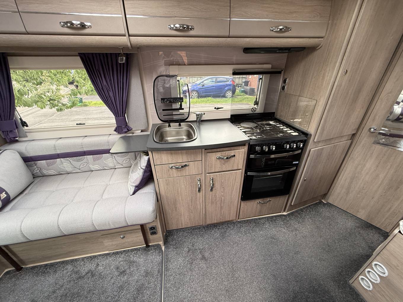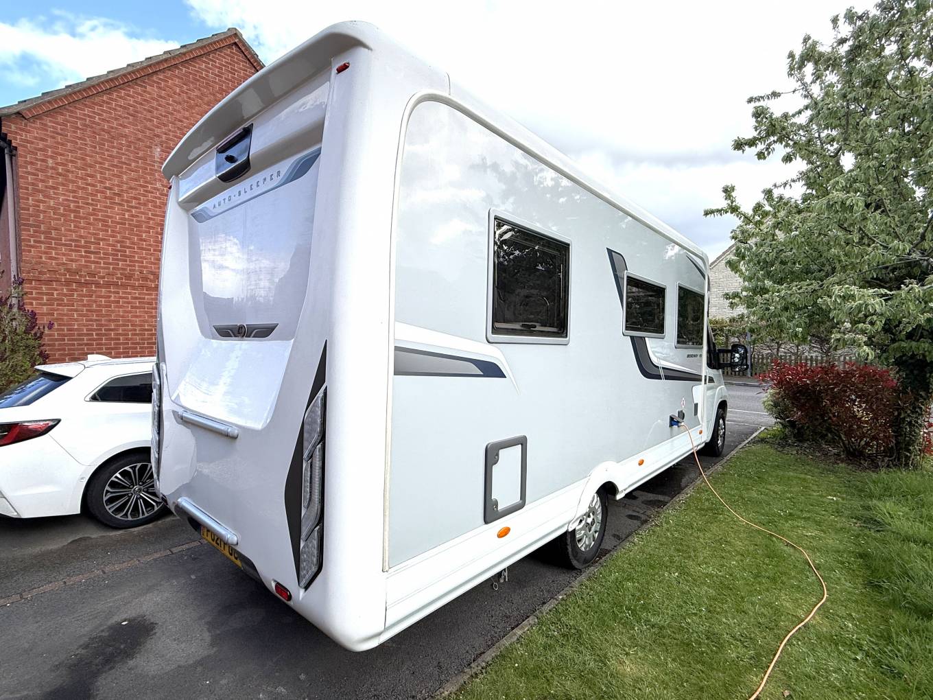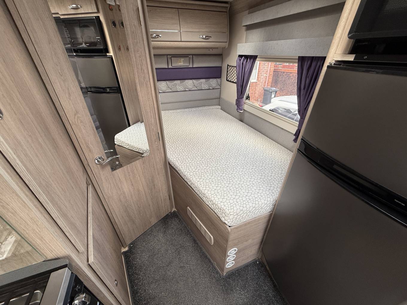 4 berth, 2 travelling seats. Rear French bed layout with additional sleeping space available from the front lounge area. Washroom includes separate shower, cassette toilet and wash basin.
