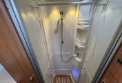 The interior showcases Hymer’s renowned build quality, with a spacious lounge area and a fully equipped kitchen including hob, oven/grill, fridge/freezer, and ample storage. The washroom benefits from a separate shower, making it practical for extended trips.