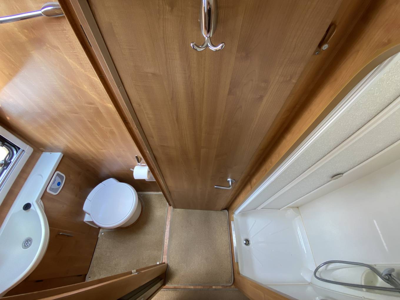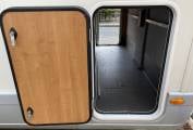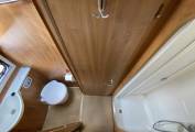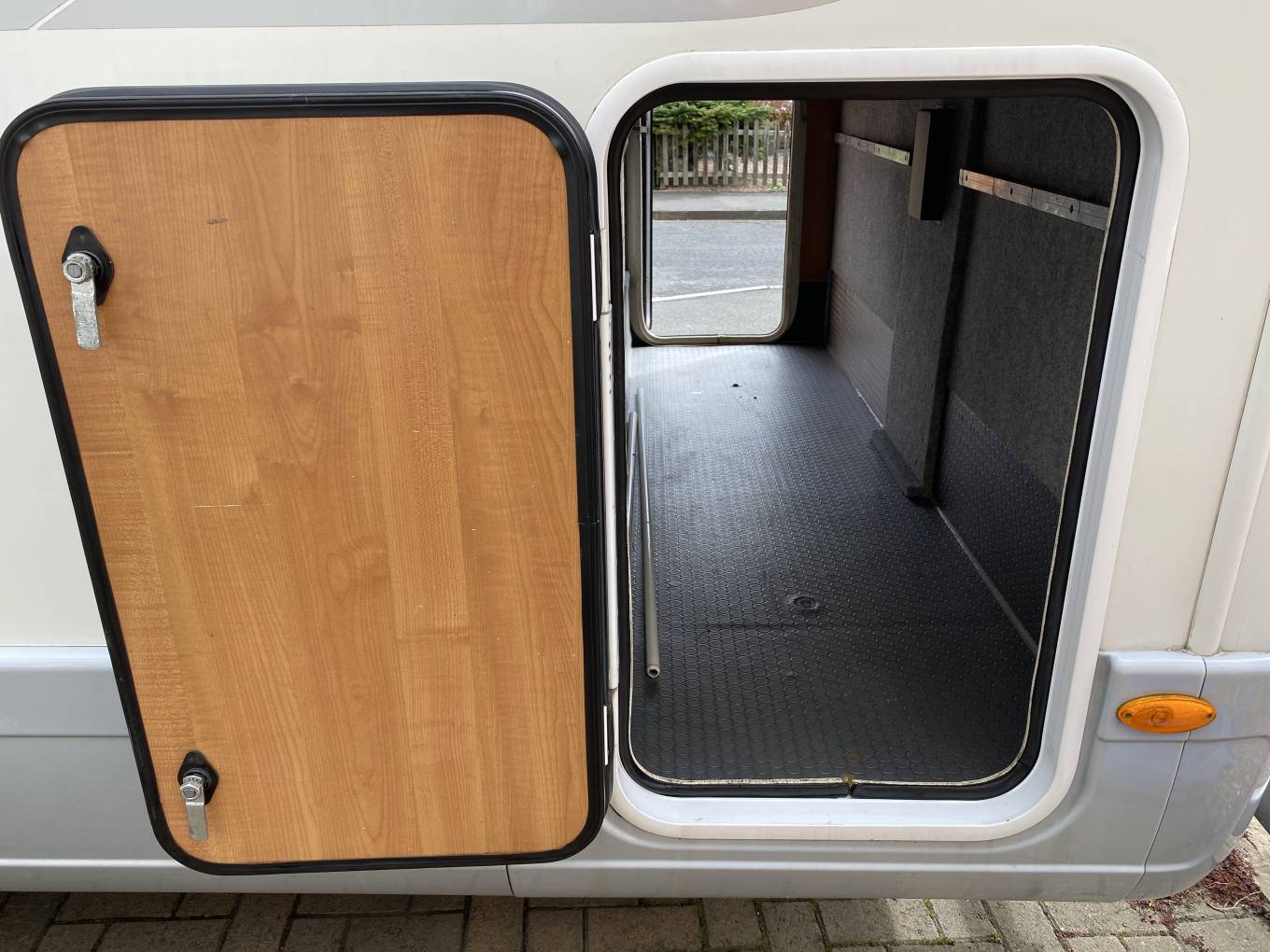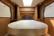 Outside is the distinctive silver cab with colour coded front bumper, access doors to the garage space from both sides with mains socket. Wind out awning, electric entry step, external BBQ gas point, external shower point, hab door full flyscreen, solar panel, reversing camera, Oyster sat dish, TV aerial, gas locker with space for two bottles includes one re-fillable bottle, pannier locker, leisure battery locker with two leisure batteries, towbar, 16 inch alloy wheels, cross-climate tyres, access to SOG toilet cassette and mains hook up point.
