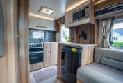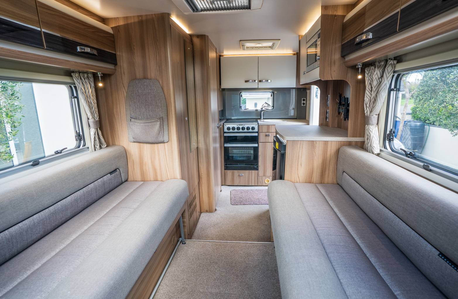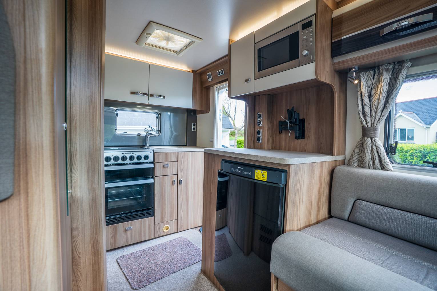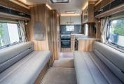 Kitchen | Amongst all of the design features - the Layout of this vehicle is likely its standout feature. The Rear bathroom and Kitchen combination, means you can keep your chores away from your relaxation. The kitchen opens up into the rear habitation door, and comes fully equipped with a dual oven/grill, 3 way Fridge/Freezer, Built in Microwave, 3 Gas Hobs/1 Electric and plenty of storage space. This is all stylishly lit up with a backlit wall LED and is surrounded in ample storage.