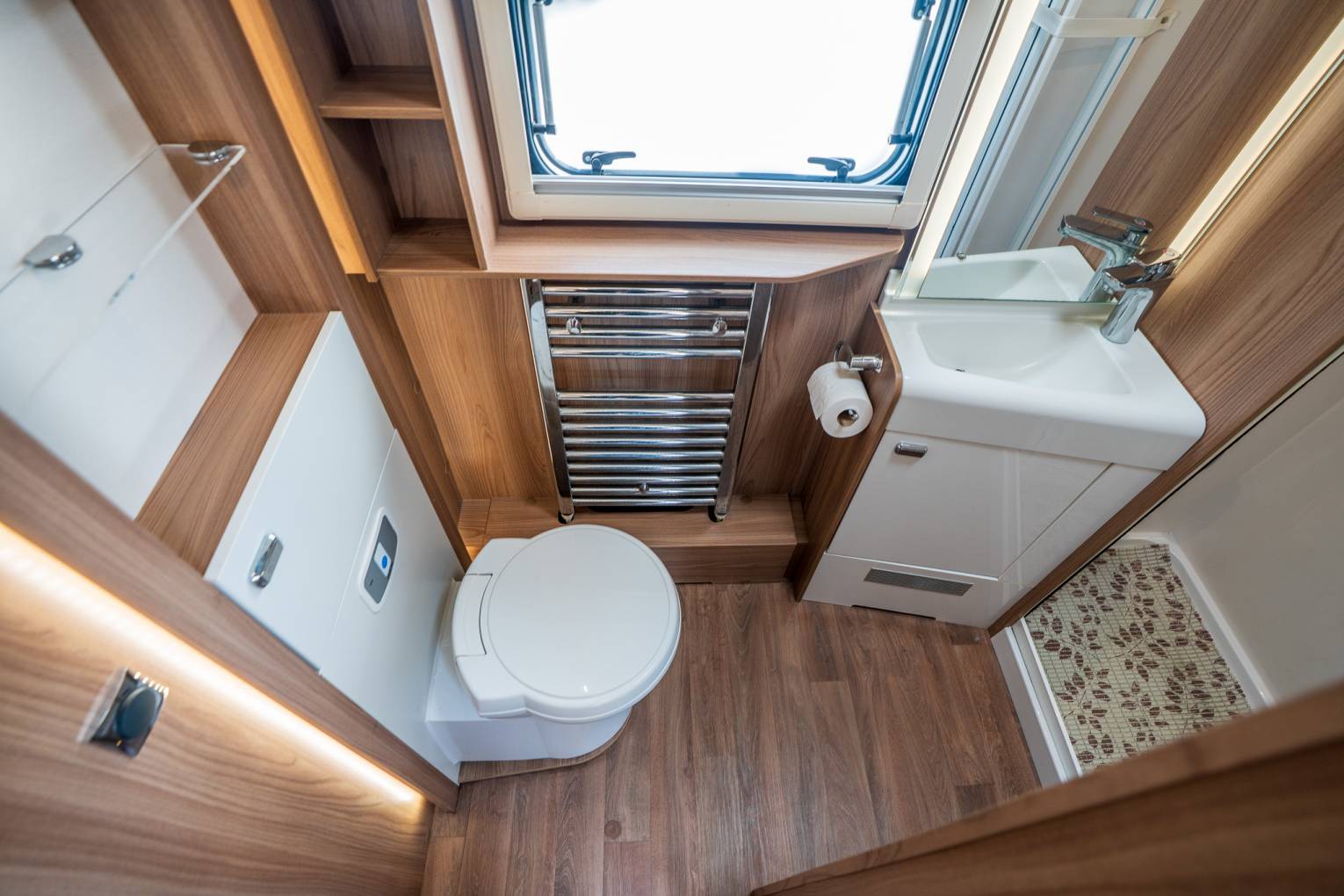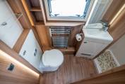 Ablutions | The layout features a spacious end washroom with a large separate shower, a cassette toilet with electric flush, and a wash basin with a mixer tap. Unusually for a motorhome, there’s a generous amount of storage for toiletries and a large square footage for the entire bathroom. A window at the far end lets in plenty of light,whilst a towel rail adds that little extra comfort and luxury in your new home away from home.
