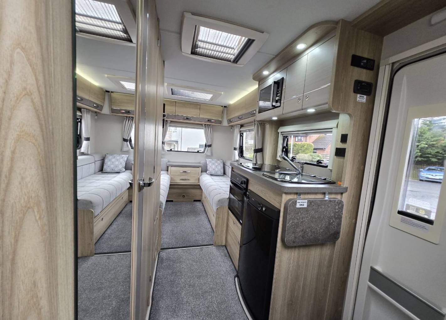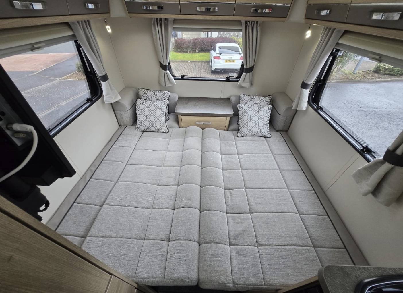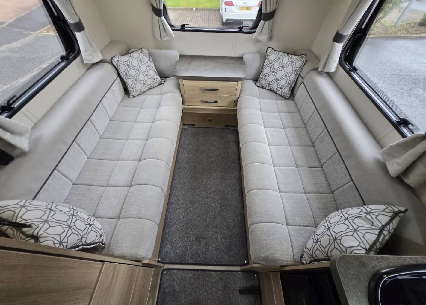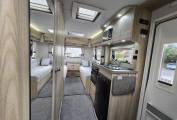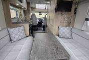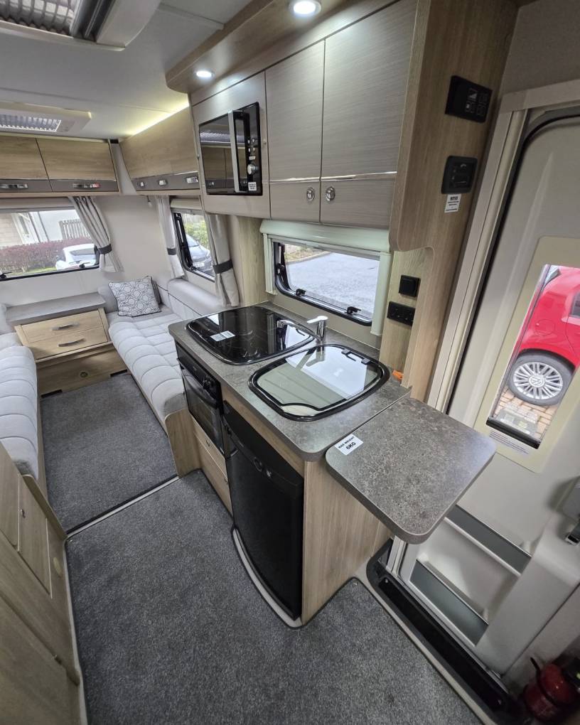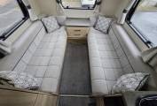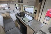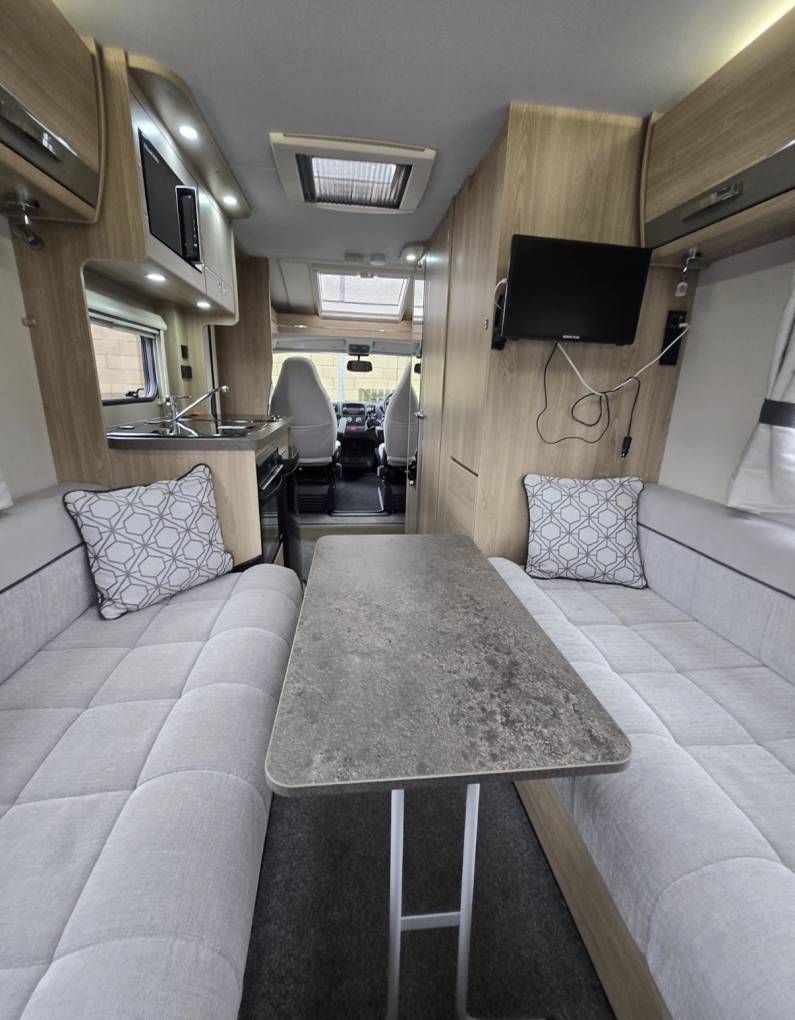 The layout of this modern and wonderfully maintained motorhome is as you enter the side door starting at the rear of the motorhome you have a wonderfully comfortable lounge area with 2 bench seats. The lounge can be used as single beds or the settees can be made into a large double bed. This area has large windows which allow the natural light to flood in and for dining area you have a free standing folding table to create the ideal dining area comfortably seating 4 people.
