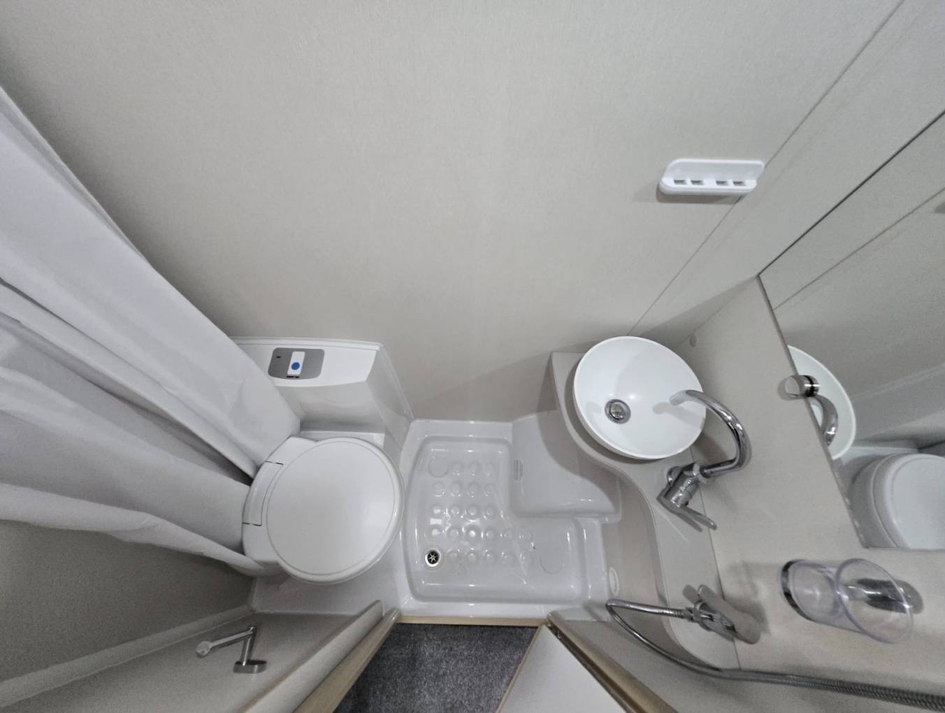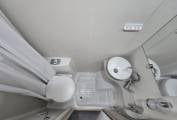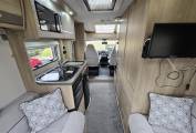 Moving forward you come to the extremely well equipped kitchen area with oven and grill, 3 burner gas hob, good worktop space, microwave, black enamel sink with glass top for extra preparation area, fridge with freezer and additional flip up work top area. The Accordo 120 also comes with plenty of cupboard and storage space for all your utensils. The all-in-one space-saving washroom is located opposite the kitchen with sink, shower and toilet. Moving to the front cab area you have the 2 front seats that swivel round giving you more seating space.