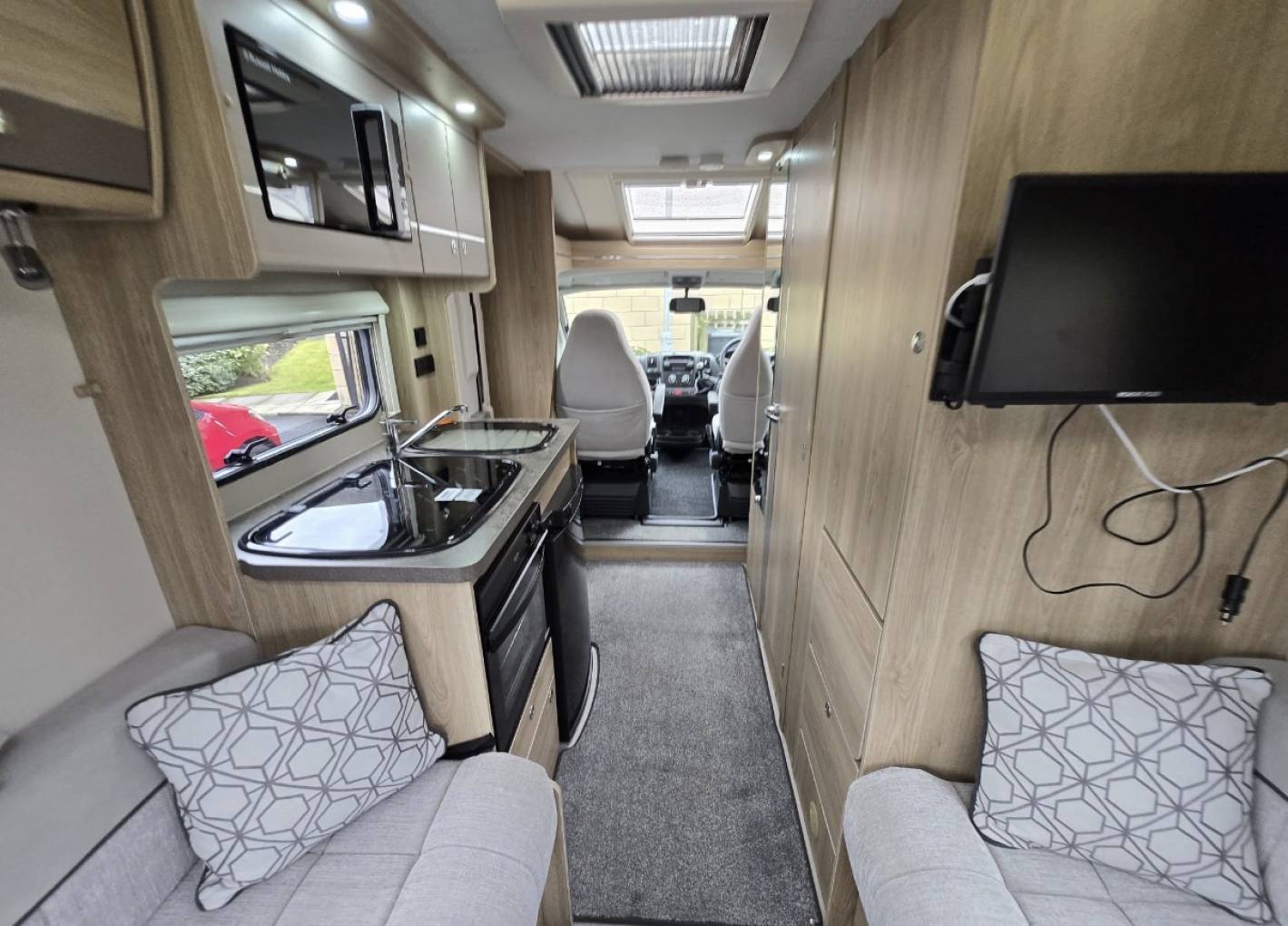 Other great features of this motorhome include Cab Aircon, Cruise Control, Skyview Cab Sunroof and Blind, Cab Blinds, Microwave, Wall Mounted TV with Teleco Aerial and outside it’s been fitted with a Fixed Side Awning and a Bike Rack.