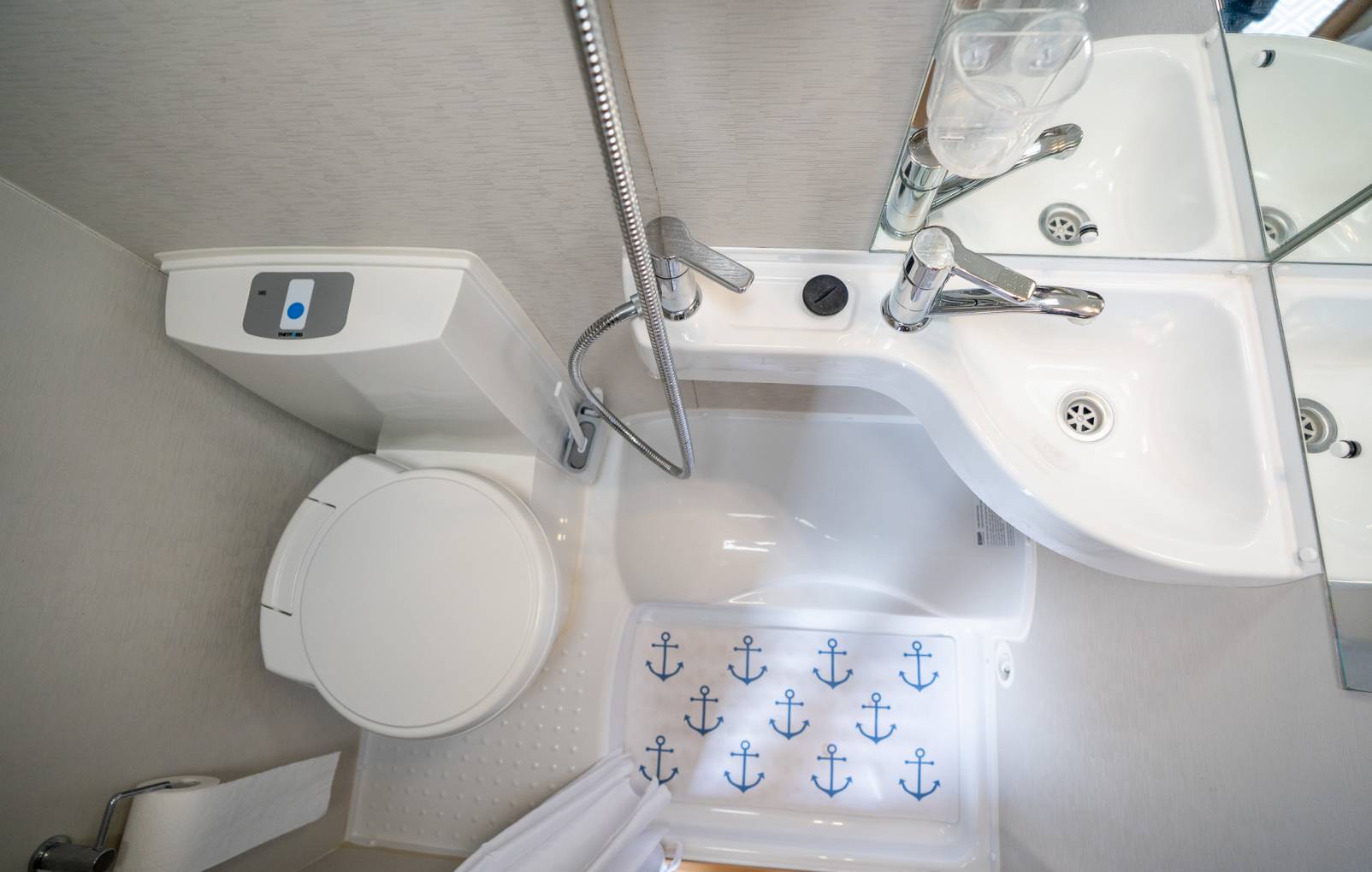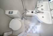 Bathroom | The bathroom represents a fantastic use of space in an already well equipped home. It comes complete with a Thetford Toilet, vanity sink, mirror and a shower area separated by curtain.