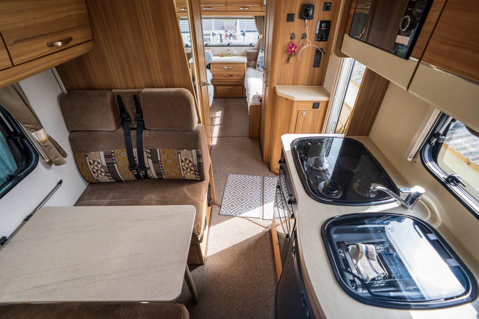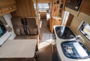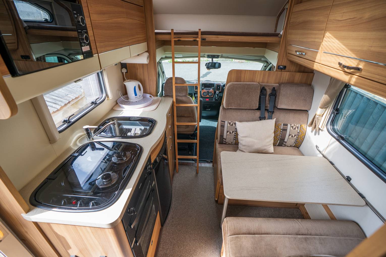 Kitchen | The Kitchen comes fully equipped with 3 Gas Burners & 1 Electric hob, a sink, a built-in Russel Hobbs microwave, Thetford Oven/Grill and a Dometic 3 Way powered Fridge/Freezer. This is all expertly surrounded by an abundance of worktop space, lockers and cupboards, so you have plenty of space to cook even the more complex meals for the whole family. Coupled with the spacious living room and dining table, means mealtimes can still be a treat in your home away from home.