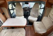 The cosy dinette with two swivel cab seats forms a sociable living area, ideal for relaxing, dining, or planning your next destination. Large windows flood the space with natural light, enhancing the airy feel and offering pleasant views wherever you’re parked.