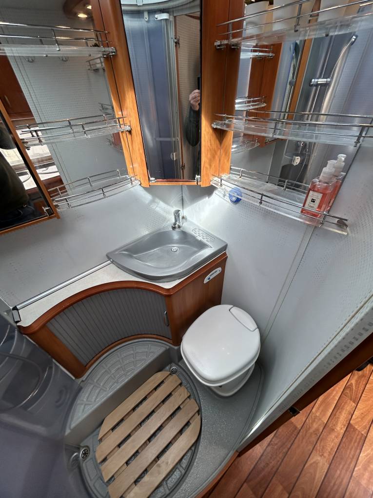 Moving forward, the well-appointed mid-kitchen ensures you’ll never have to compromise on meals while travelling. Equipped with a 3-burner gas hob, oven and grill, alongside a fridge with a freezer compartment, it has everything you need to cook and dine just as you would at home.