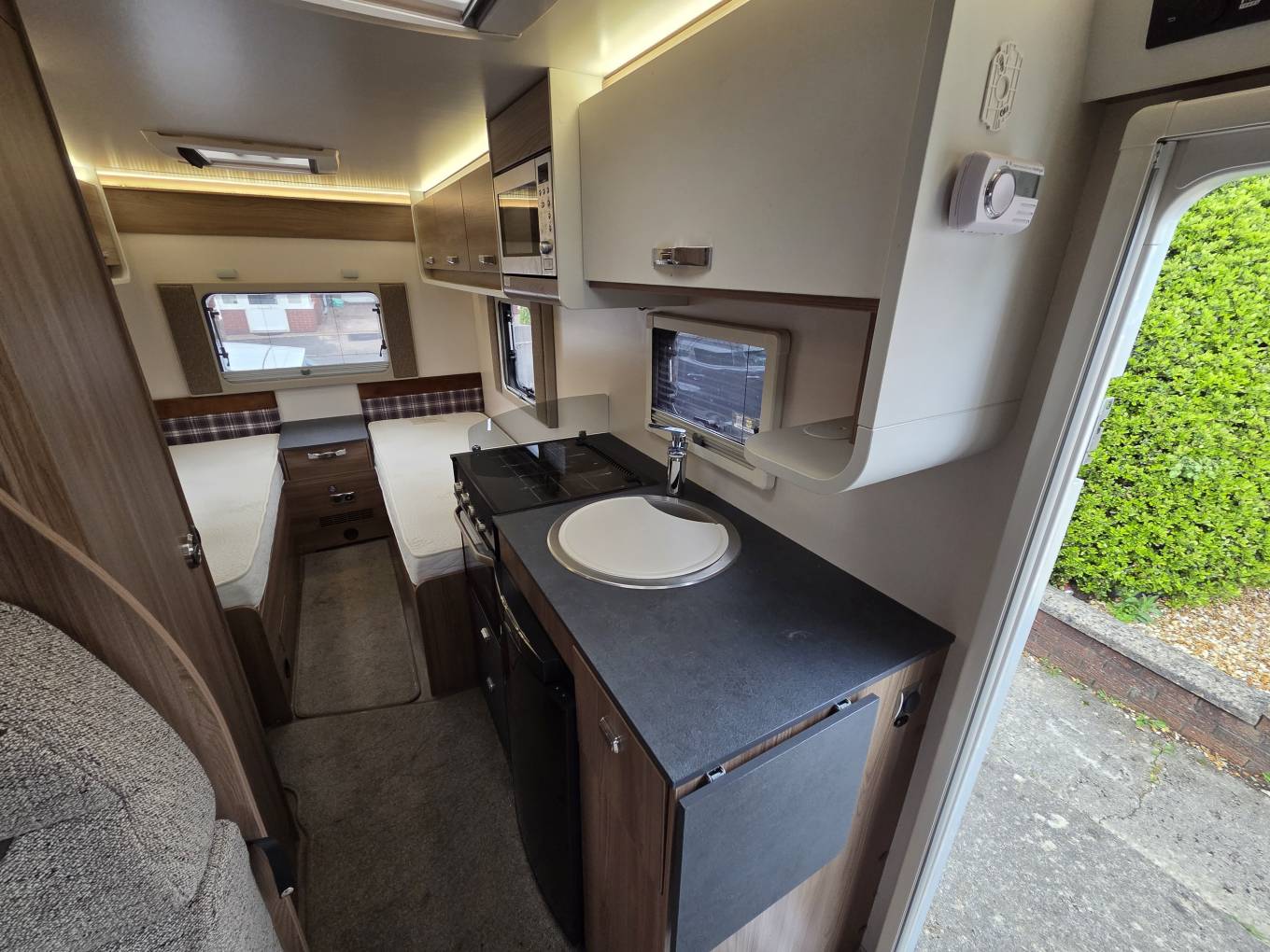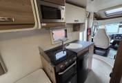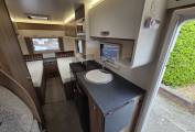 To the right of the habitation door is the galley style kitchen which consists of: extendable leaf for extra work surface; Stainless steel bowl shaped sink with chrome mixer tap above; full sized oven & grill with a 3 burner gas hob above. Below the counter is a Dometic automatic 3 way fridge with freezer box that can be powered by 240v, 12v or gas depending if you are plugged in on site or wild camping. There is plenty of cupboard & drawer space for all your holiday provisions & utensils & a Microwave oven for use on site.