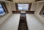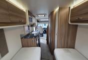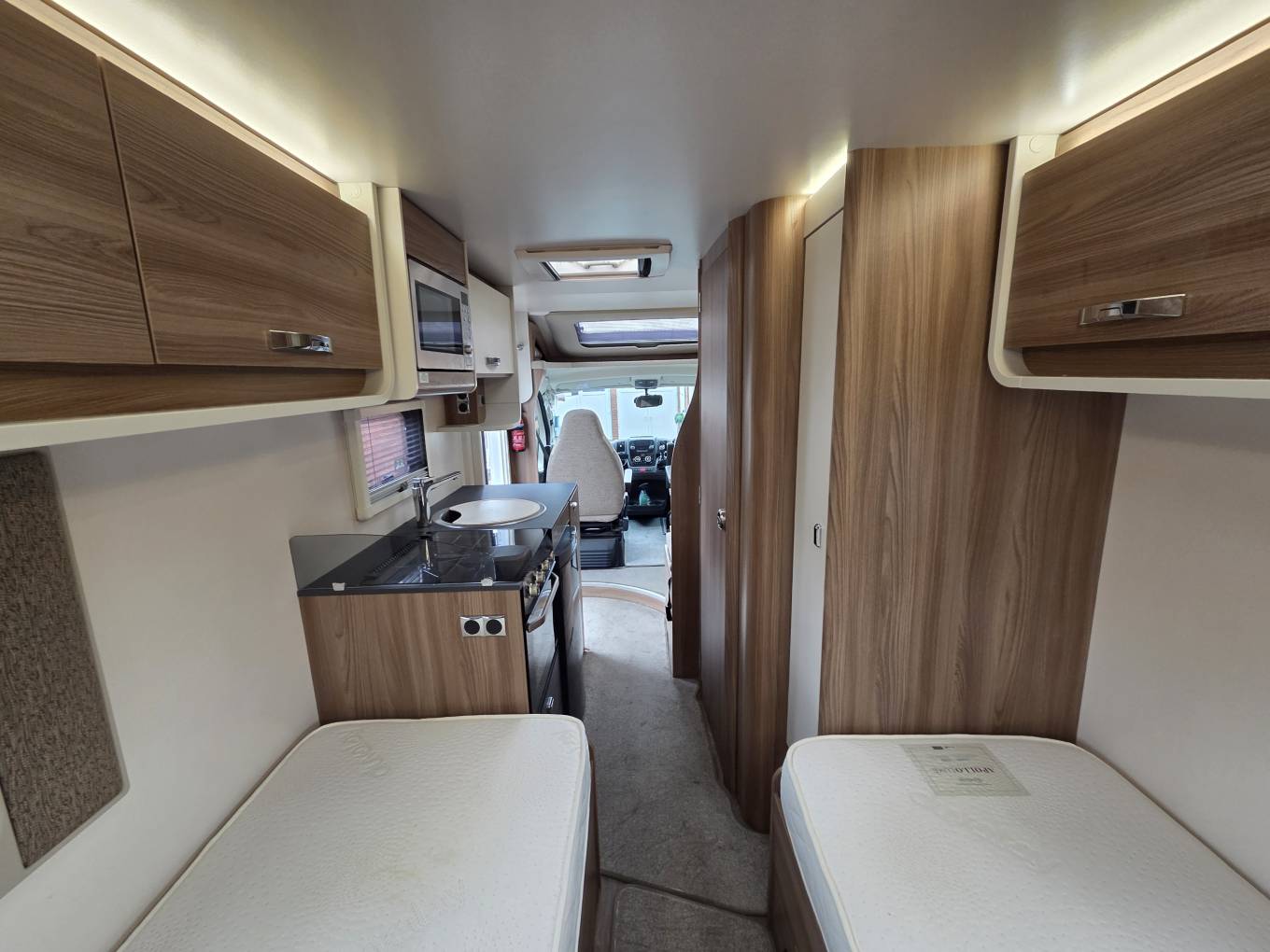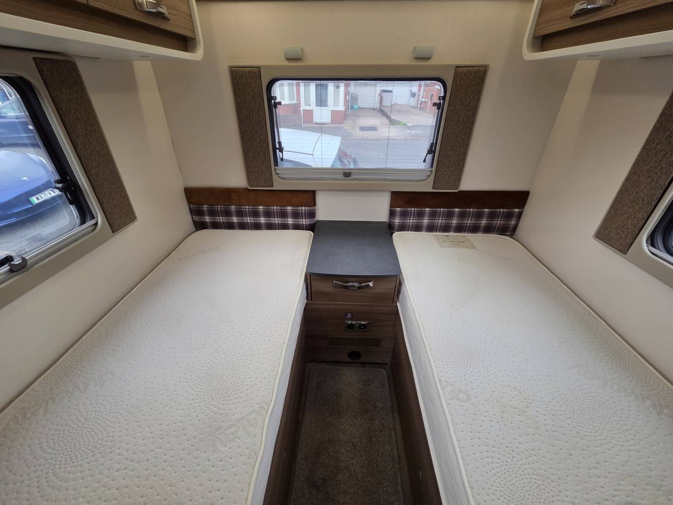 Finally to the rear in the main bedroom with its fixed single beds & bedside table between, for your morning tea or coffee. There is plenty cupboard space and a USB for the all important electronic devices.