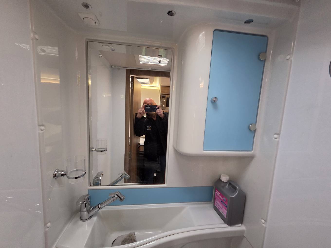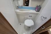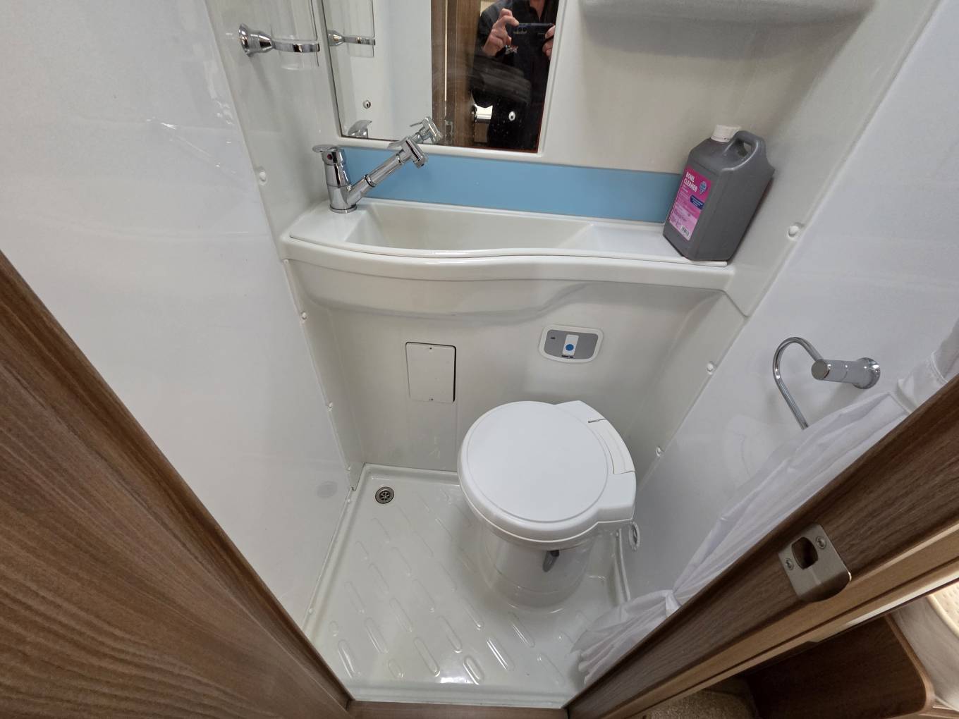Opposite the kitchen is the modern bathroom which is a wet room style. The toilet a Thetford cassette unit with electric fresh water flush & swivel head. There is a built in white sink above with chrome mixer tap. The shower head extends from the mixer tap and fixes above whilst in use. Next to the toilet is a hanging wardrobe which houses the Aeriel & booster box for the TV.