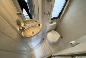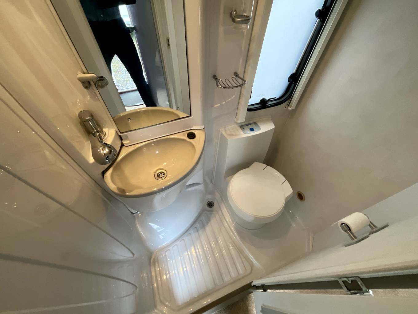 To the side, the washroom is spacious and features a shower, washbasin, vanity unit and Thetford toilet with cassette.