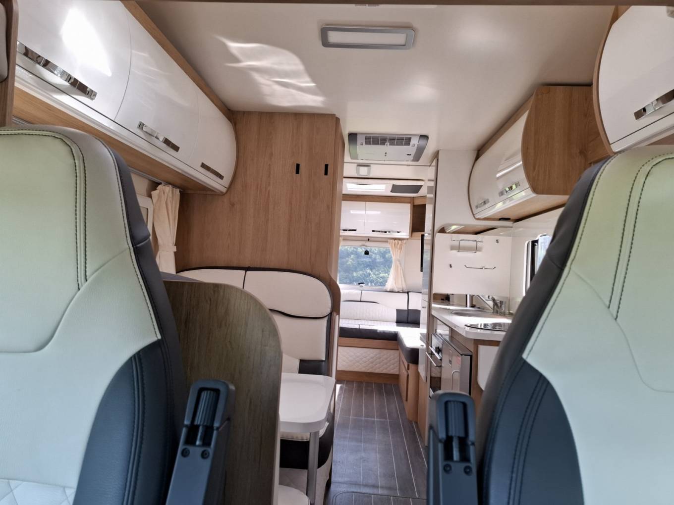 Behind the drivers cab position is a full dinette dining and leisure area (with two additional forward facing seat belts and two rear facing lap belts). The dinette can be converted to a small double berth if required.