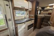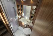 The mid ship kitchen is well equipped for touring, featuring a 3 gas hob, oven, sink and a tall Dometic fridge with freezer compartment, along with good cupboard and drawer storage. The separate washroom is neatly laid out with a dedicated shower cubicle, cassette toilet and wash basin, a more practical arrangement.