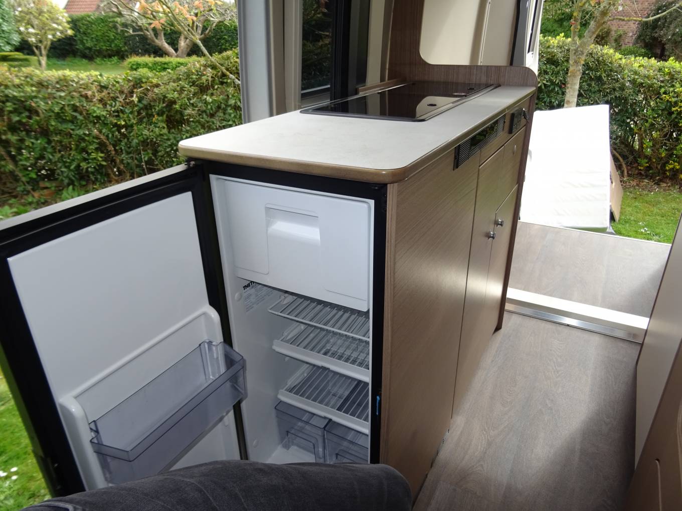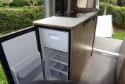 As you enter the side door you have the Kitchen area to your left mid position on the drivers side, with 2 gas hob burner, sink with hot & cold mixer tap, all in stainless steel. Low level and high level storage cupboards, cutlery drawer, 2 240 v sockets and a USB point. Thetford 12v fridge is cleverly arranged on the end and has a 54 litre capacity.