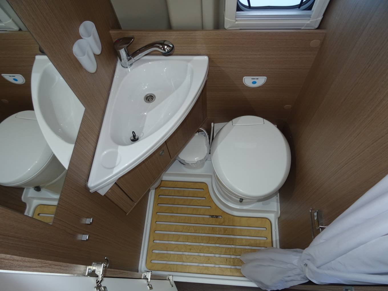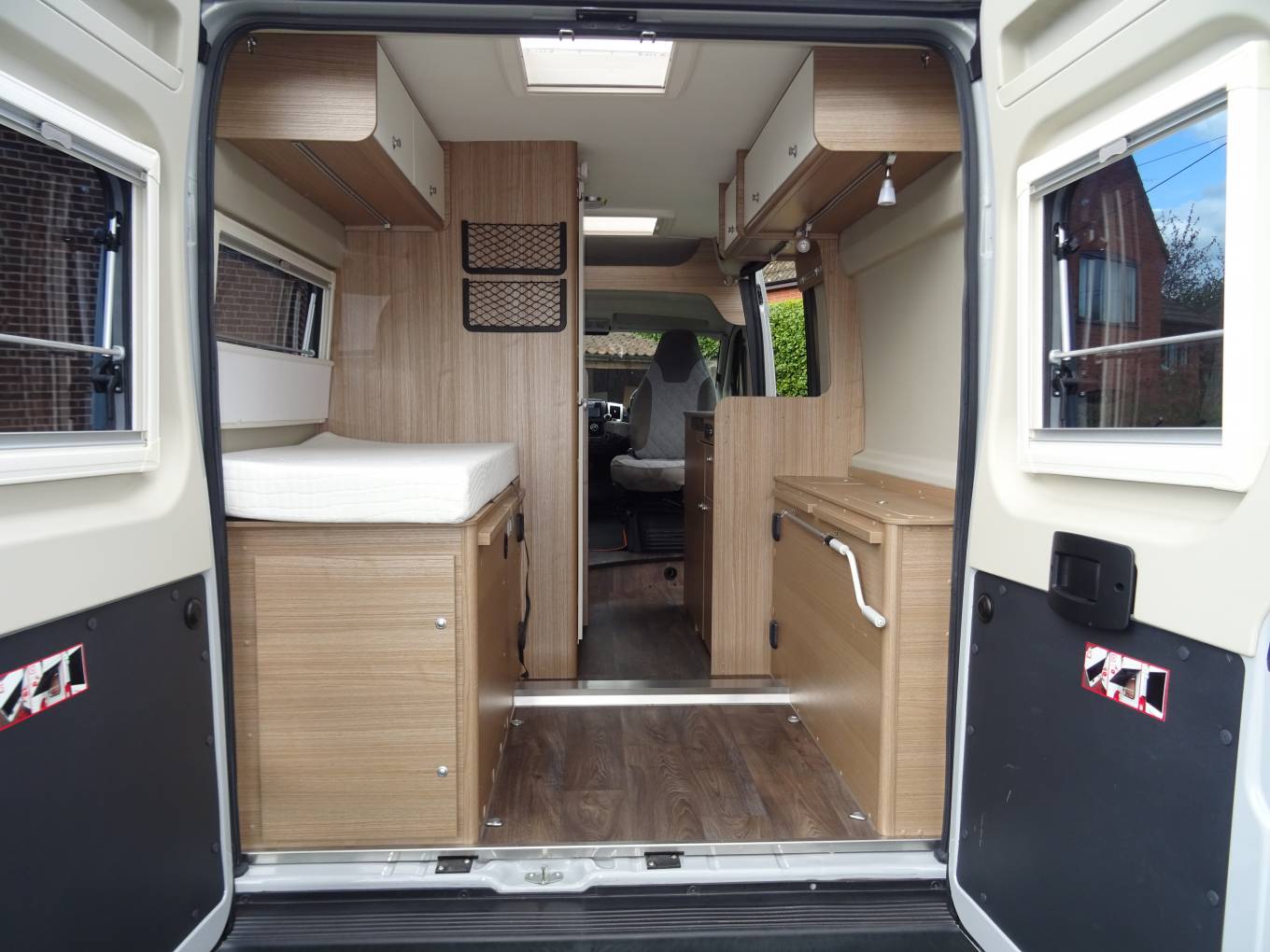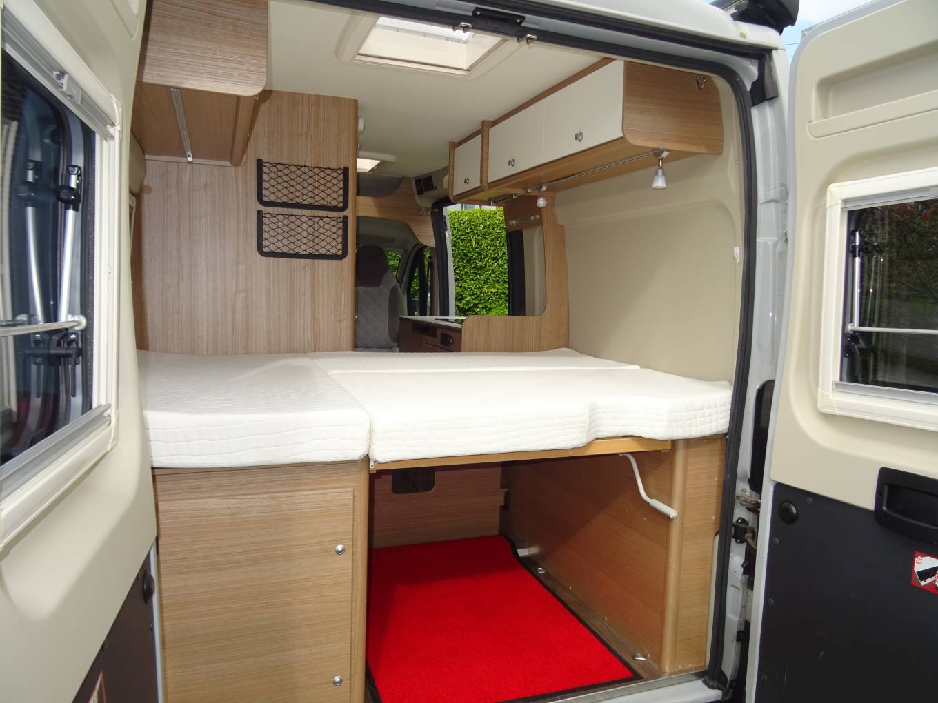 At the rear, is a fixed transverse double bed with good central storage underneath and side cupboard for 2 gas bottles. The bedroom has windows to side and rear with a skylight above, all with blinds and fly screens. Storage cupboards, lighting and a USB point.