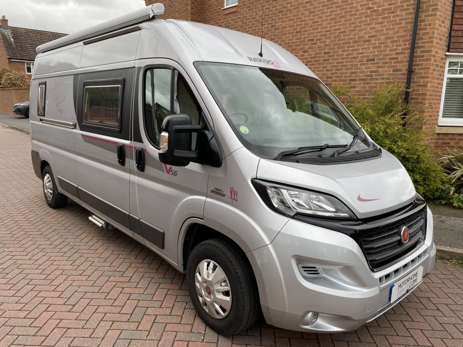 LOCATED IN WARWICKSHIRE, is this superb RAPIDO V56 in silver metallic paint finish. First registered in March 2015, it is a 3 berth and 4 travelling belt motorhome with the much sort after rear bed with storage layout. Based on the Fiat Ducato 130Bhp 2287cc diesel engine combined with a six speed manual gearbox. MOT is valid until March 2027. It has 48,196 miles on the clock and was last serviced in March 2025 at 44,795 miles, cambelt changed in 2023 and will have a habitation check completed prior to the sale. Been with the current owners for the last ten years.