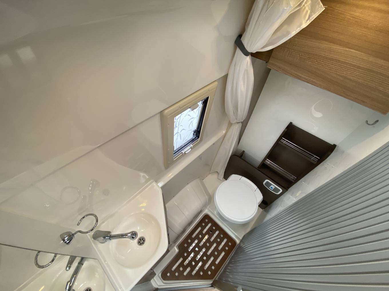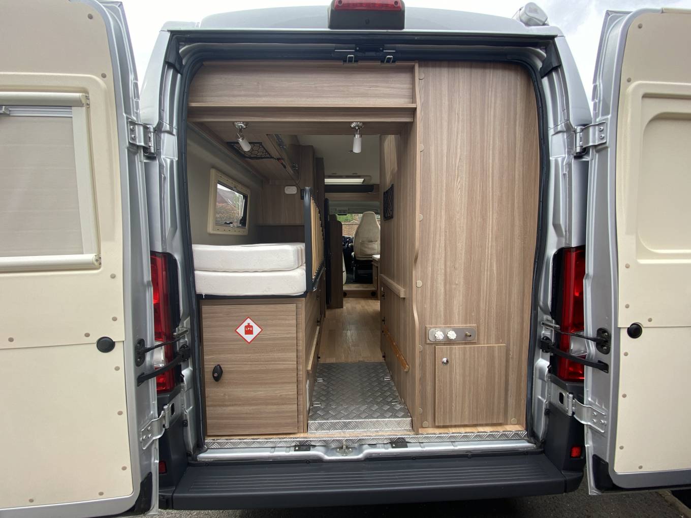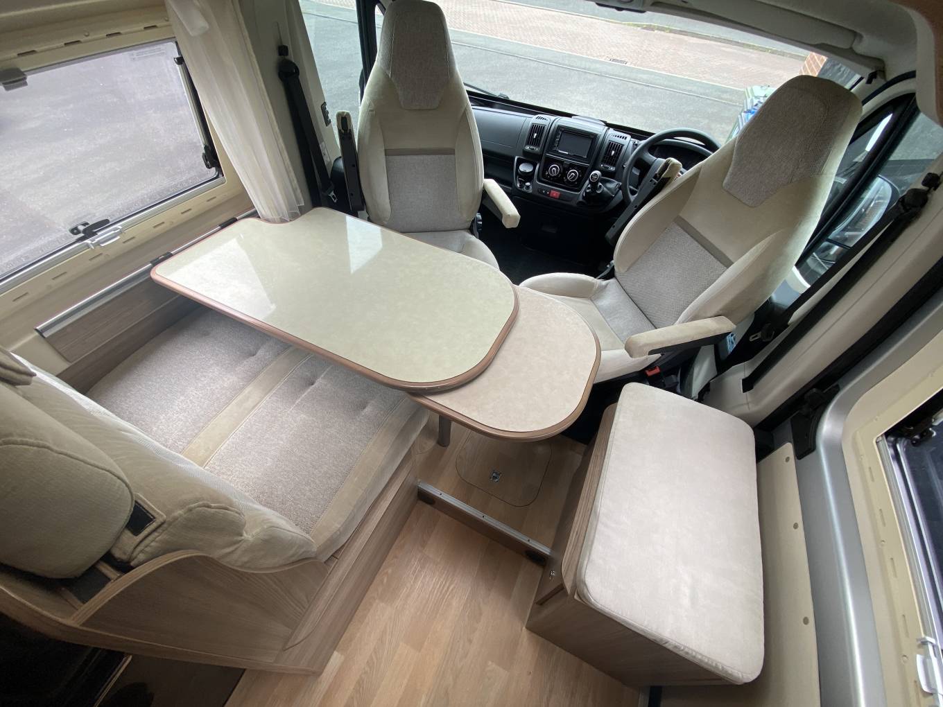 Outside there is a Fiamma F65s wind out awning, solar panel, electric entry step, external shower point, TV aerial, full habitation door flyscreen, awning light, gas locker with space for two bottles, currently with one 11Kg bottle Autogas re-fillable LPG system, reversing camera, Sigma cat 2-1 alarm and mains hook up point. The main dinette table can be easily installed for convenient outside dining.