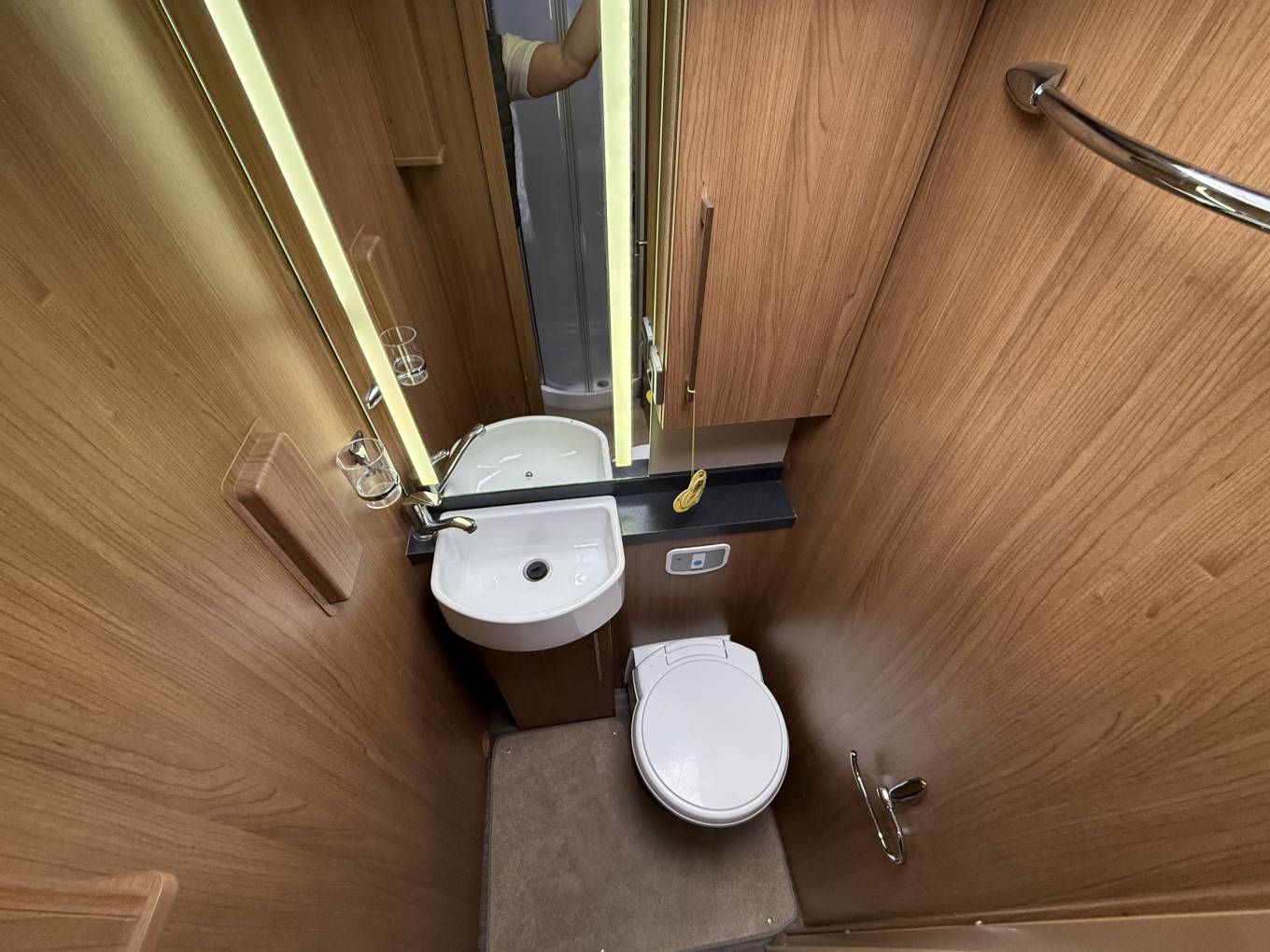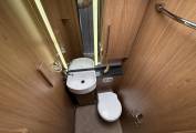 The washroom setup offers both practicality and privacy, with a separate shower and toilet area, ensuring all the comforts of home wherever your travels take you. The Al-Ko chassis design not only enhances stability and driving confidence but also provides increased payload, making this motorhome perfect for longer adventures without compromise.