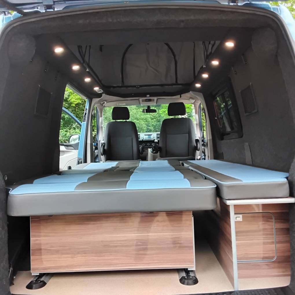 Turn every journey into an adventure with this beautifully crafted VW Transporter T6 Hide Away Campers conversion — the perfect balance of everyday practicality and weekend escape. Designed with flexibility in mind, this 4-seat, 4-berth campervan comfortably carries family and friends while effortlessly transforming into a cosy home on wheels.
