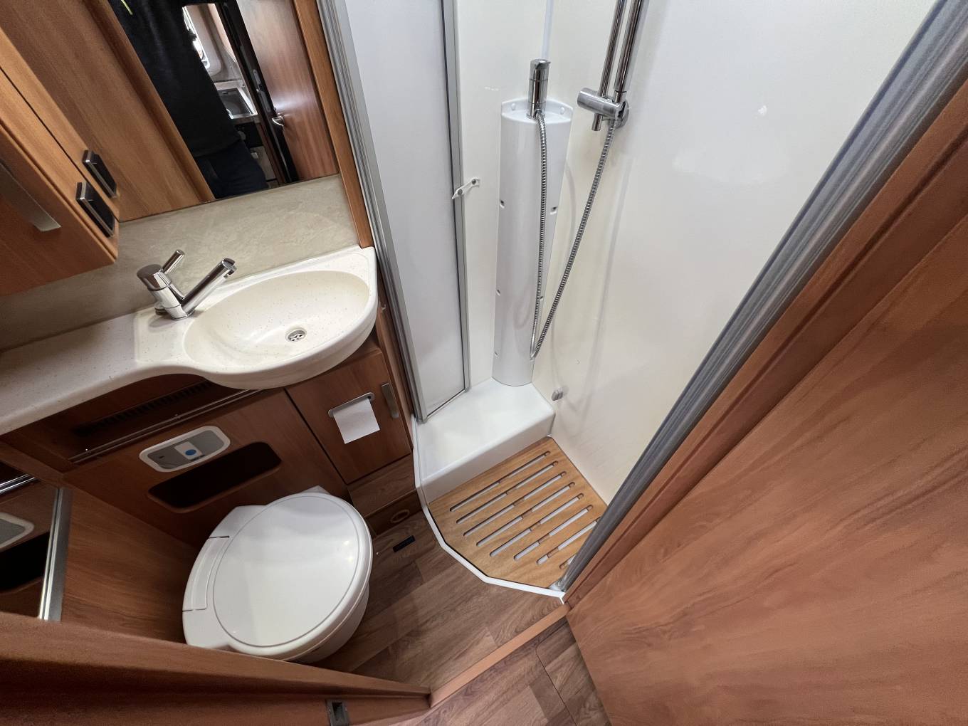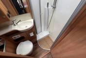 On the offside is the washroom, with full shower cubicle, toilet and sink