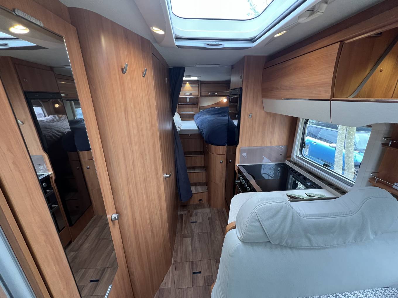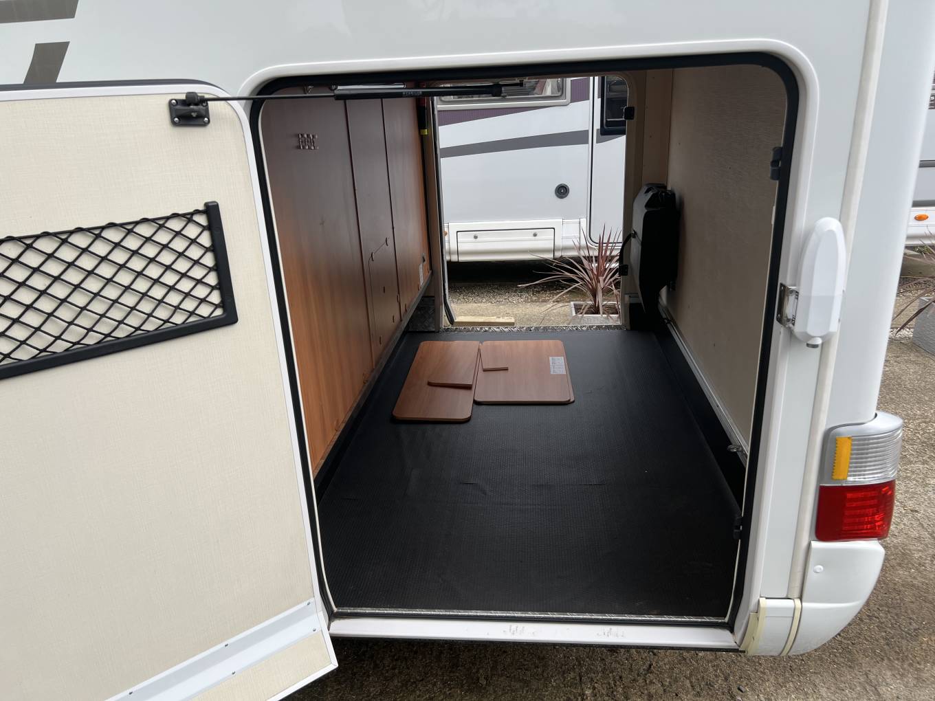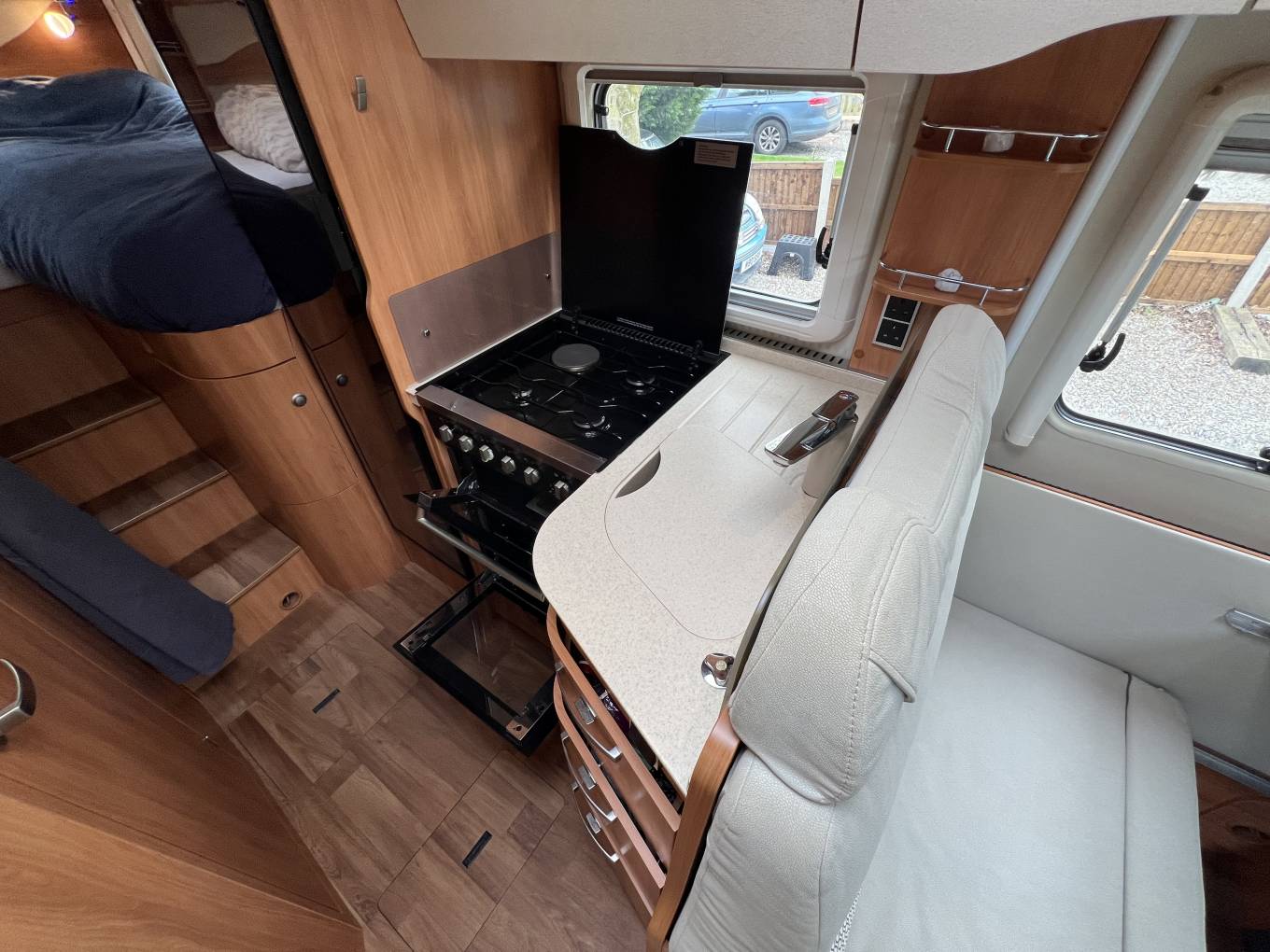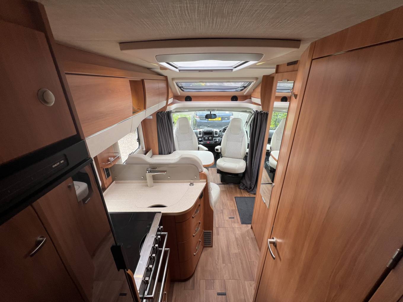 The basic layout is, rear garage, large double or 2 single beds above, washroom, with kitchen opposite, front lounge, 2 swivel seats upfront. There is plenty of storage space throughout.