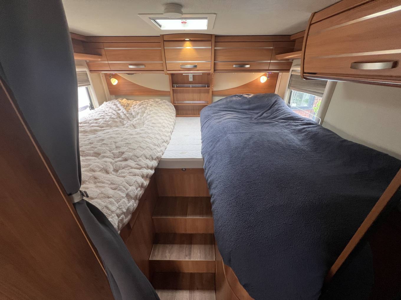 The 2 single beds can create a larger double; beneath each bed there is additional storage including hanging rail.