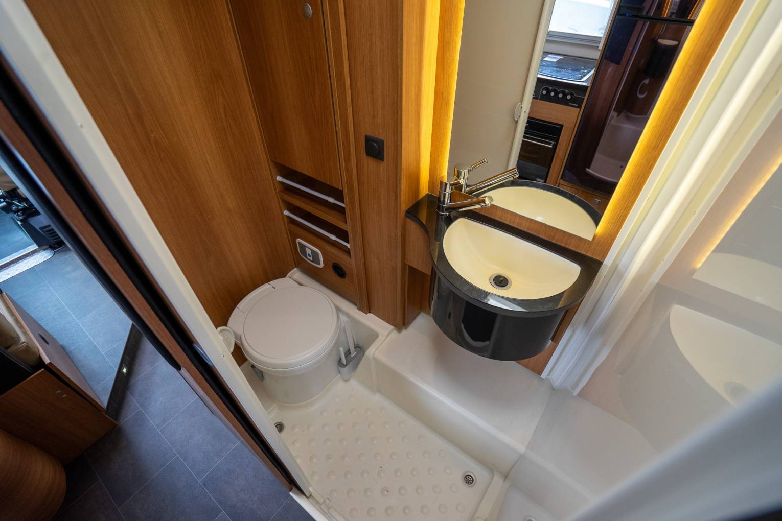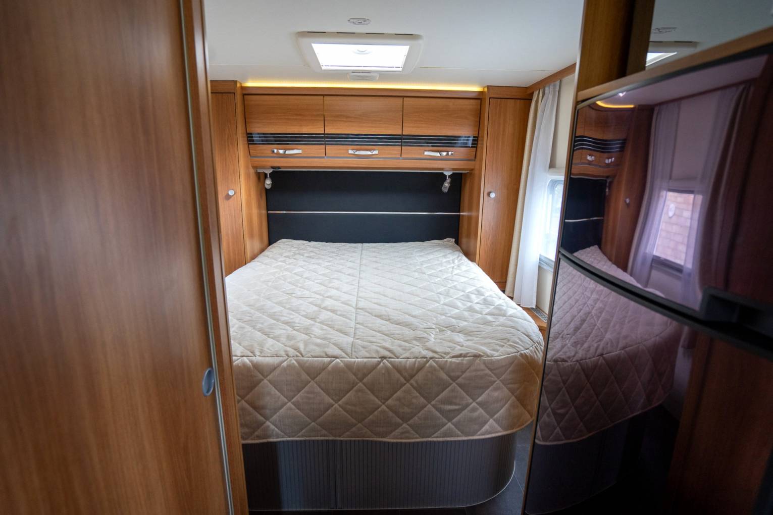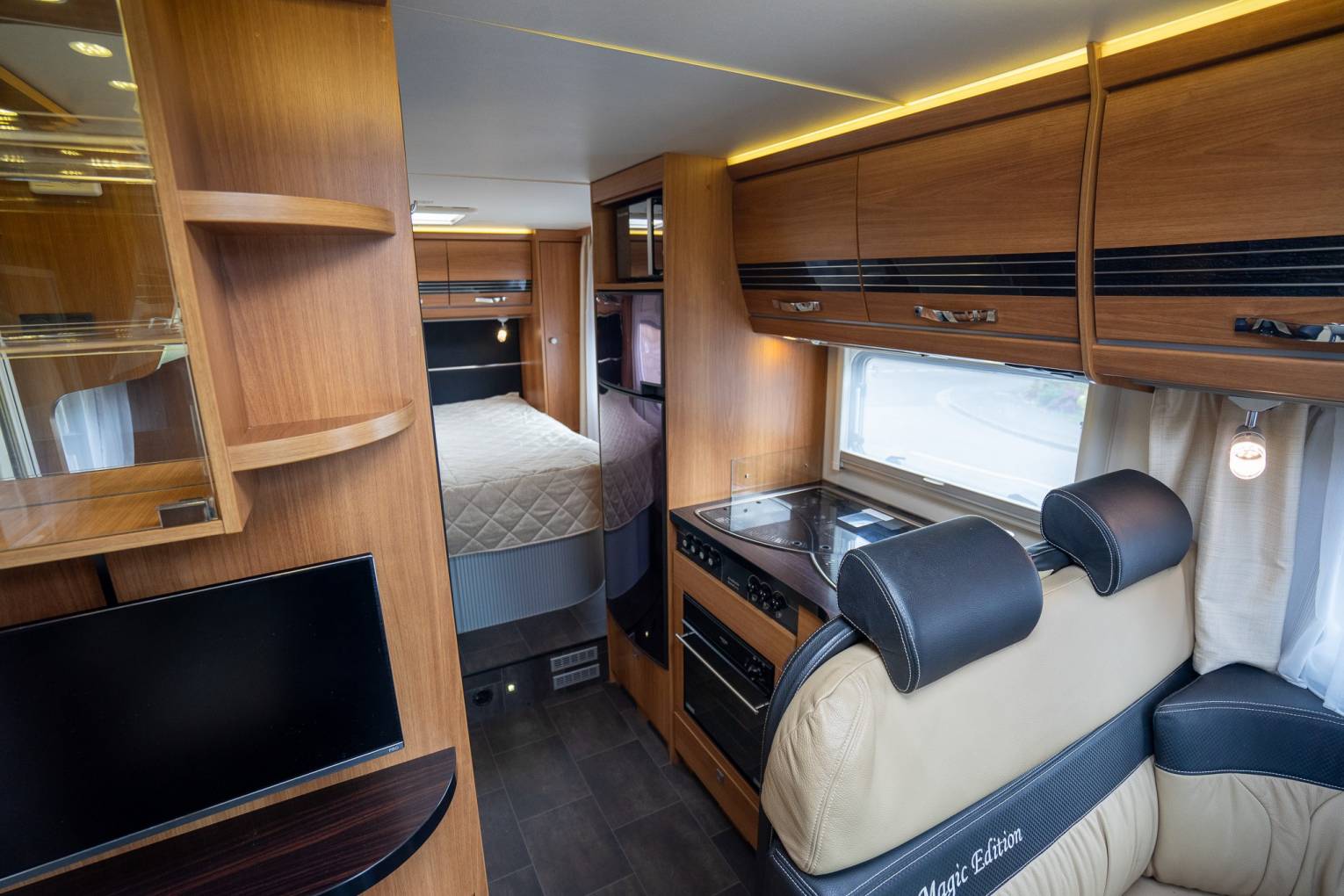 A rear opportunity to purchase this exceptionally beautiful low-profile motorhome, the Striking ‘Black Magic Edition’, finished in a stunning metallic black and silver paint scheme. It offers a sporty appearance, combined with luxurious German interior craftsmanship.