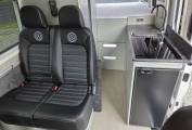 The van lay-out is optimised to provide additional habitation area seating, a washroom, kitchen with dinette area, a large fixed double bed and a very impressive sports garage.