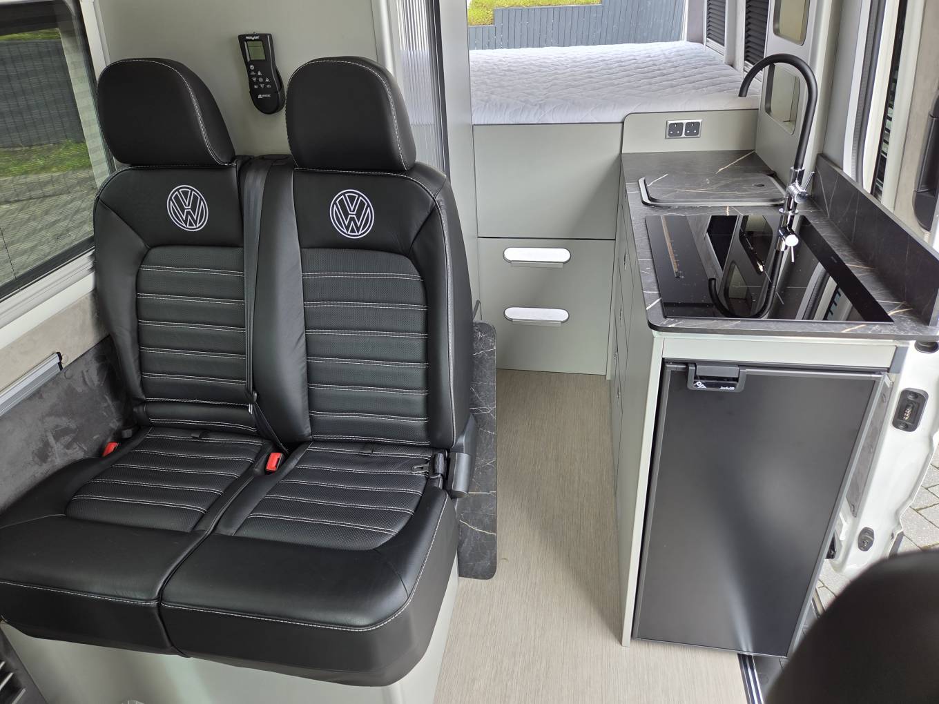 Forward facing, double seat upholstered with Alcantara leather with VW badge embroidery