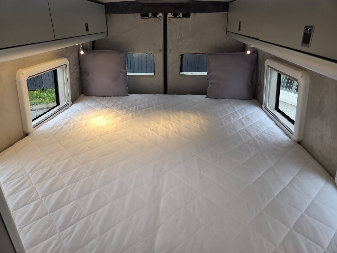 At the rear there is a large fixed double bed length: 2000mm and width:1700mm (almost a Superking size)