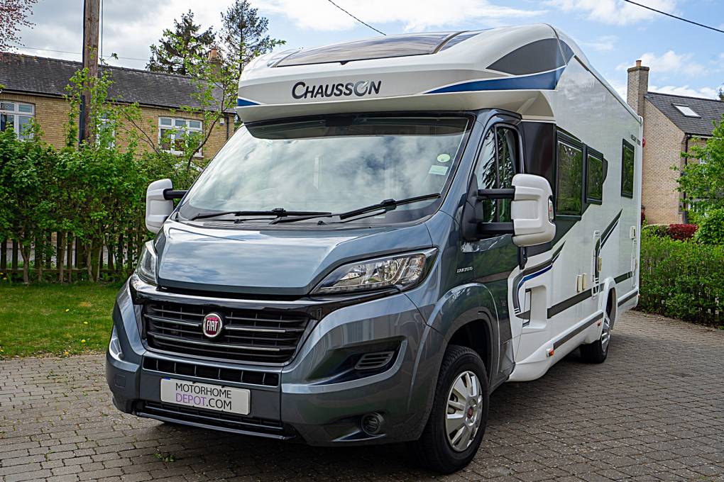 This 2015 Chausson Welcome 718 EB is a luxurious, 4-berth, low-profile motorhome with 4 travelling seatbelts. Built Fiat Ducato 2.3 (150 BHP) Chassis. This 7.46 meter model is designed for comfort, featuring a popular rear "Easy Bed" island bed configuration, a front electric drop-down bed, and a spacious rear garage.