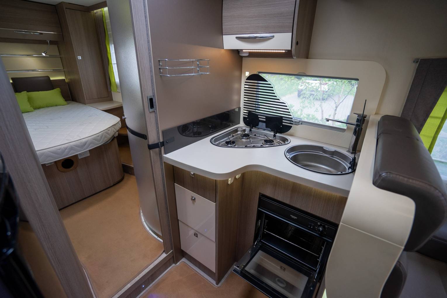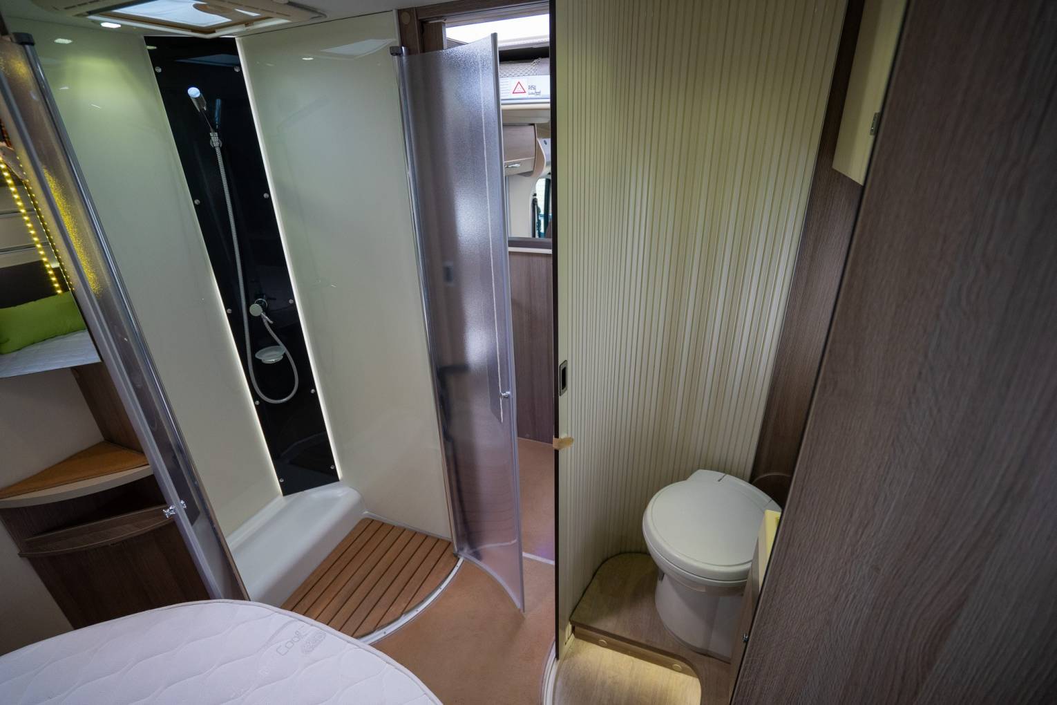 • Second Bed: Electric Drop-Down Double Bed situated over the dining area, effortless to deploy.