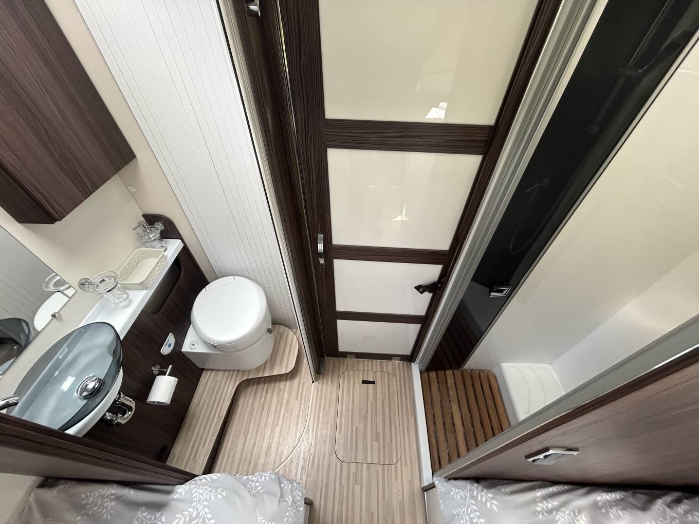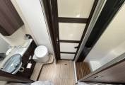 The 264 is extremely comfortable to sleep in with two rear fixed single beds (80cm wide) and also an electric double drop down bed in the centre of the motorhome. Both sleeping positions have access to a good sized split washroom with cassette toilet and vanity area on one side and a separate shower on the other. Heating and hotwater are provided by the simple to use Truma I-net system and the motorhome also benefits from the Truma Habitation air conditioning unit, essential for the hotter months.