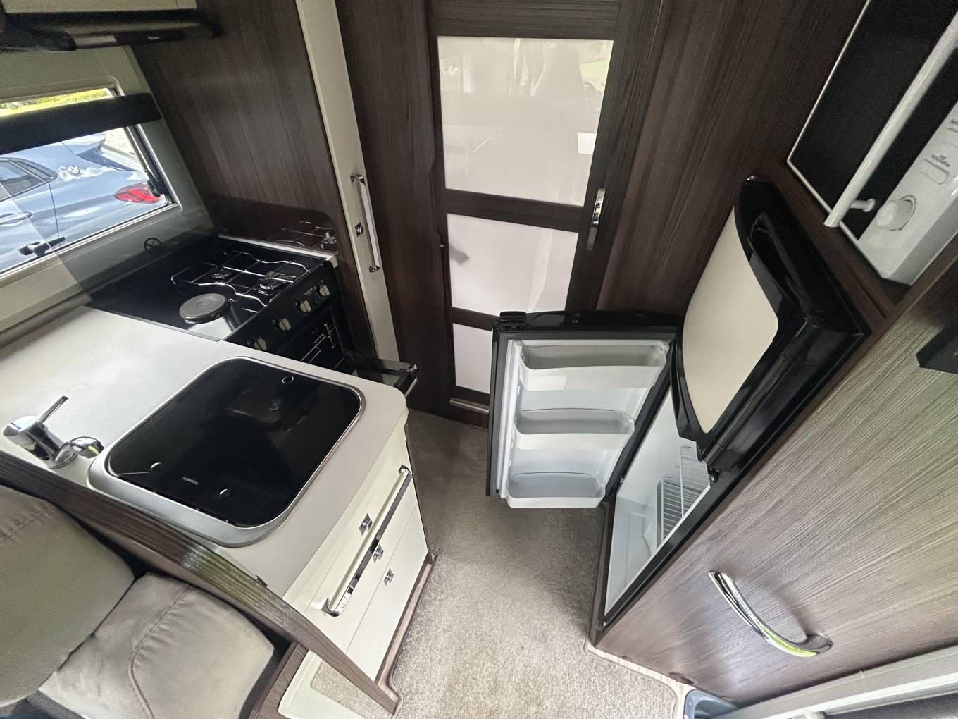 The internal layout is excellent and makes the most of the space available. At the front you have a comfortable lounge area featuring the two captains chairs, a side facing sofa and a further L-shaped sofa. There is also a multi-directional folding table, ideal for meals or snacks. Moving back you have and extremely well equipped kitchen with oven, dual fuel hob with 2 gas burners and electric hotplate, microwave oven, large fridge with separate freezer and additional cooling fan.