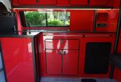 The kitchen is equipped with twin gas hob, 12v Fridge with frontage locker (extra storage and work top), sink, tap, high storage lockers and cupboards. There is a table for dining. There is good under bed storage, also tambour door cupboards at the rear and more storage under the double passenger seat.