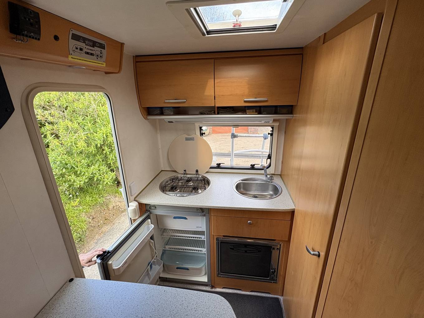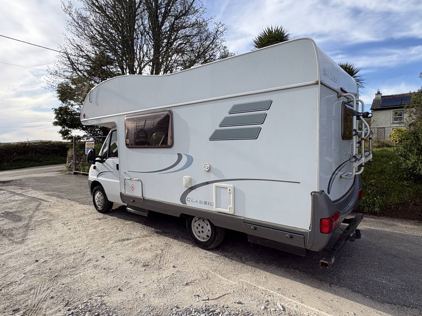 Features include – Bike Rack, Leisure Battery (changed in 2024), Gas Bottle (room for 2), Habitation Windows have Fly and Blackout Blinds, Electric Habitation Step, Aerial, Sony Radio/CD Player, USB Ports in the living area, Hook Up Cable, Fiamma Door Handle/Lock, Wind Out Canopy, Gas Heating and Hot Water, Solar Panel, Sigma Alarm, Safe and Rear Ski Locker that runs the width of the camper.