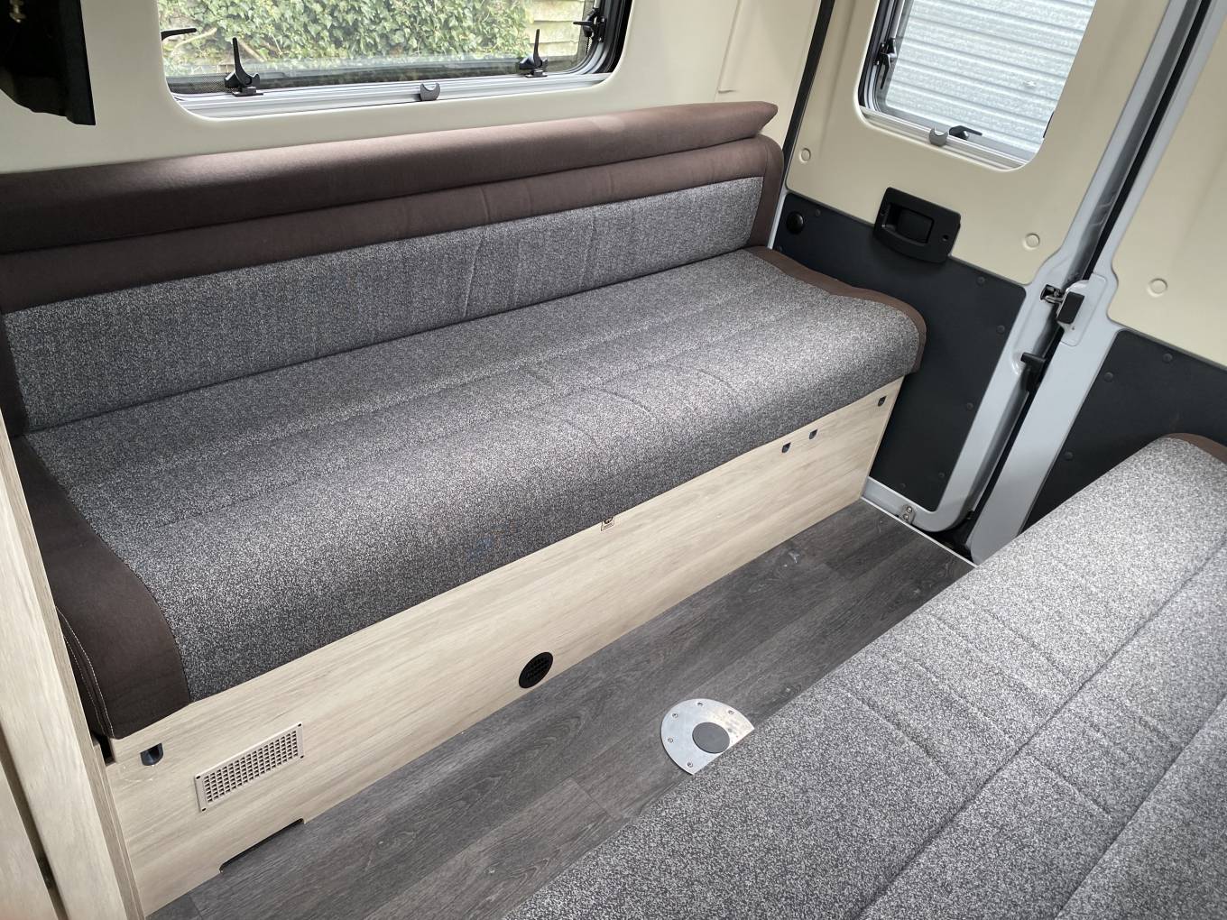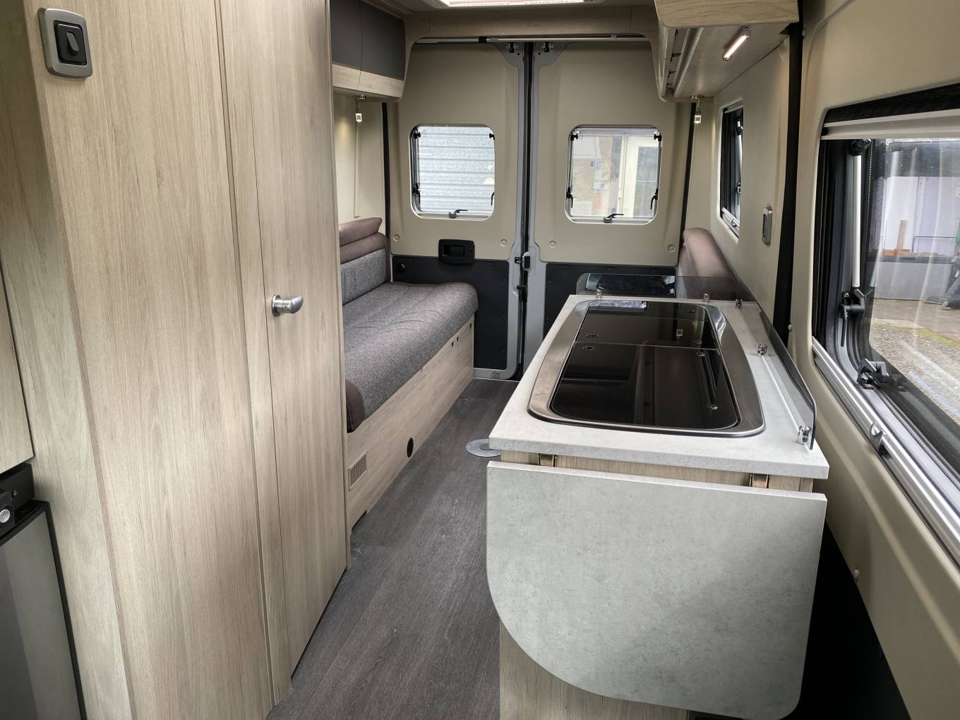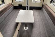 Living/Dining – Rear lounge with two long sofas, plus two cab swivel seats. A pedestal table creates a dining space or a small coffee table is used for everyday drinks.