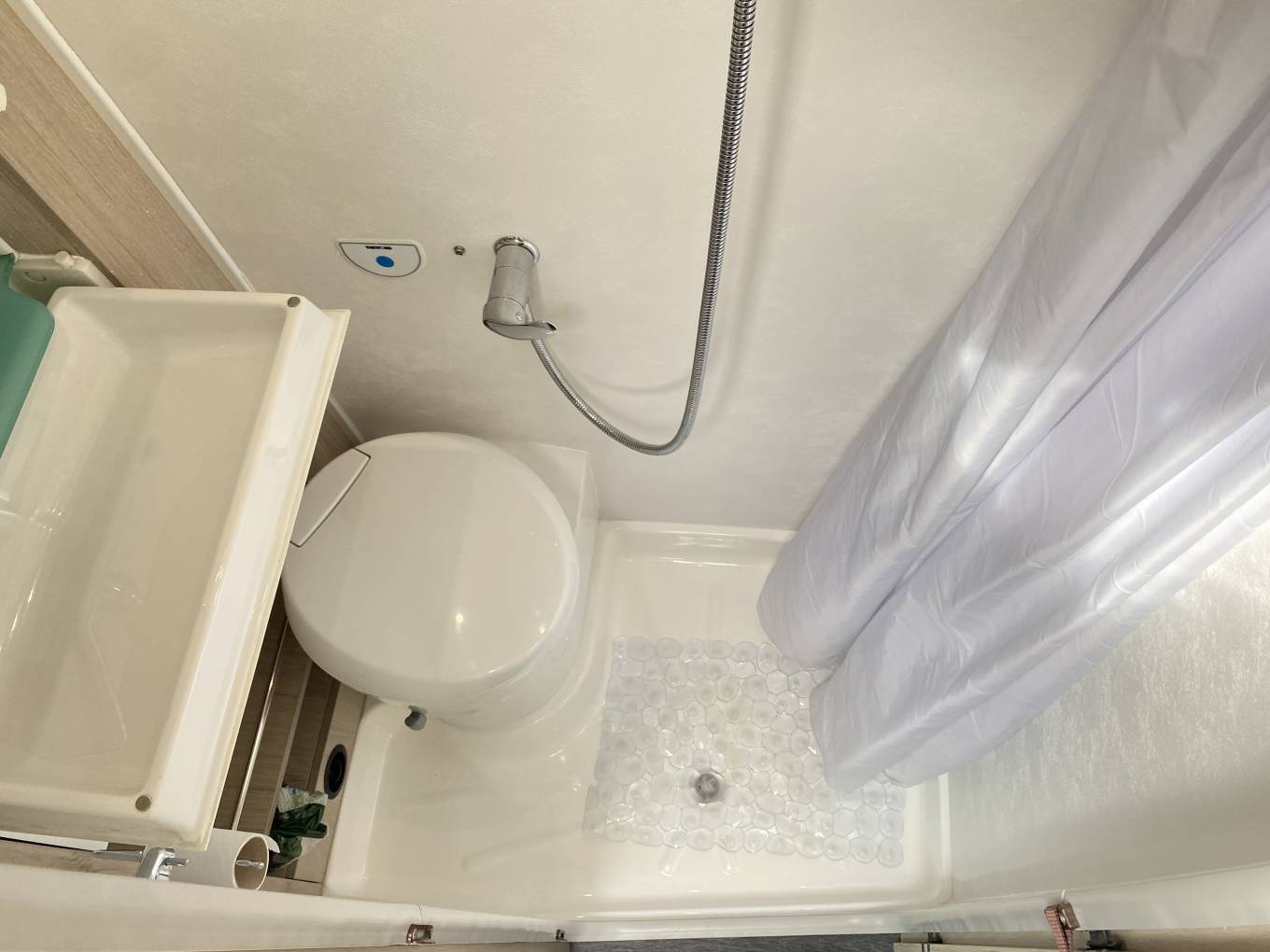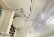 Washroom – Cassette toilet, fold-down sink, vanity unit with storage, shower with curtain.