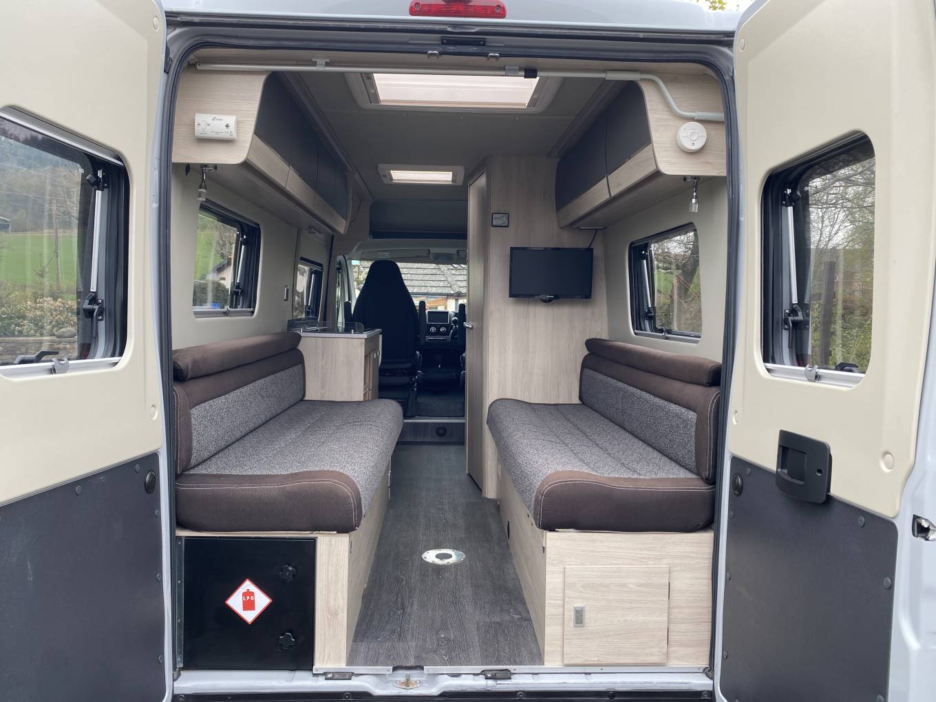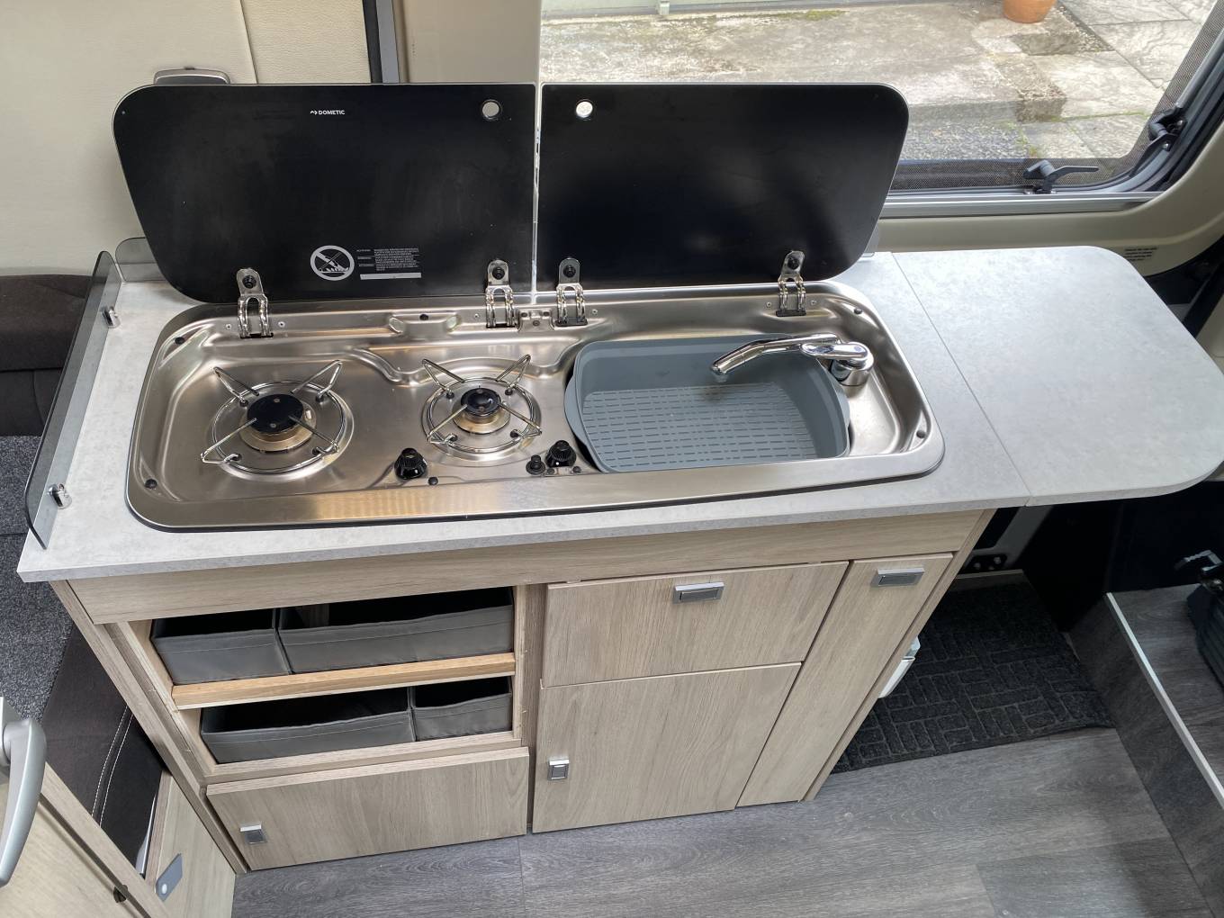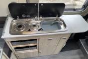 Kitchen – Two ring gas hob, hot & cold water sink, lots of low-level storage space and overhead lockers, three-way fridge, extending worktop space.