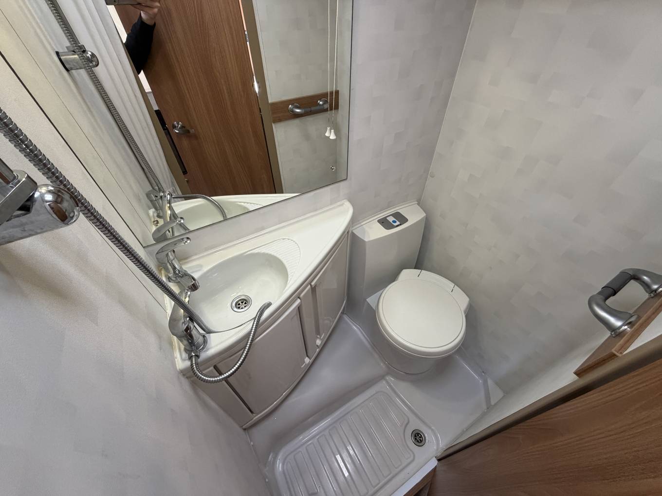 Conveniently located washroom with toilet and washing facilities, offering practicality for longer trips.