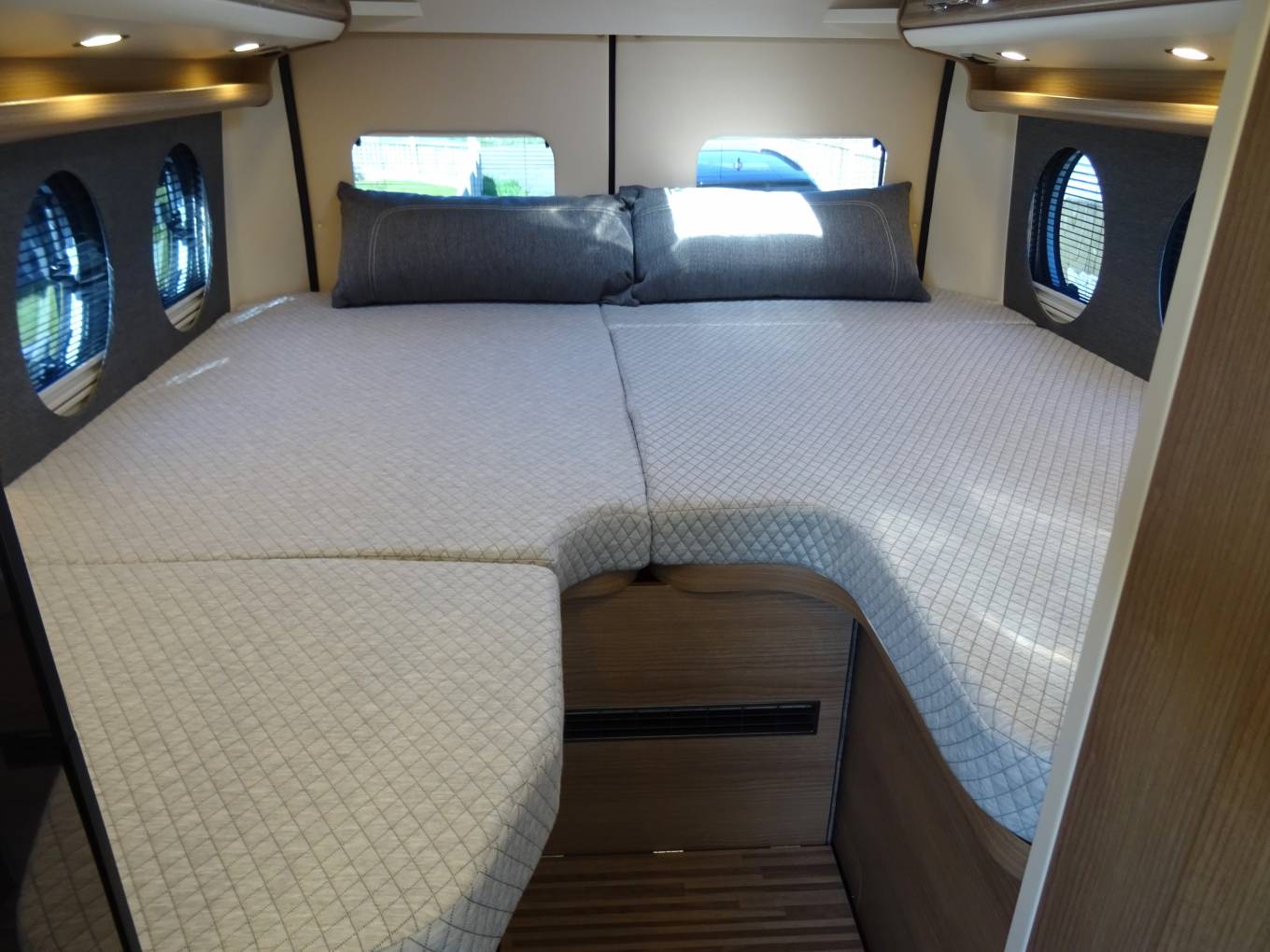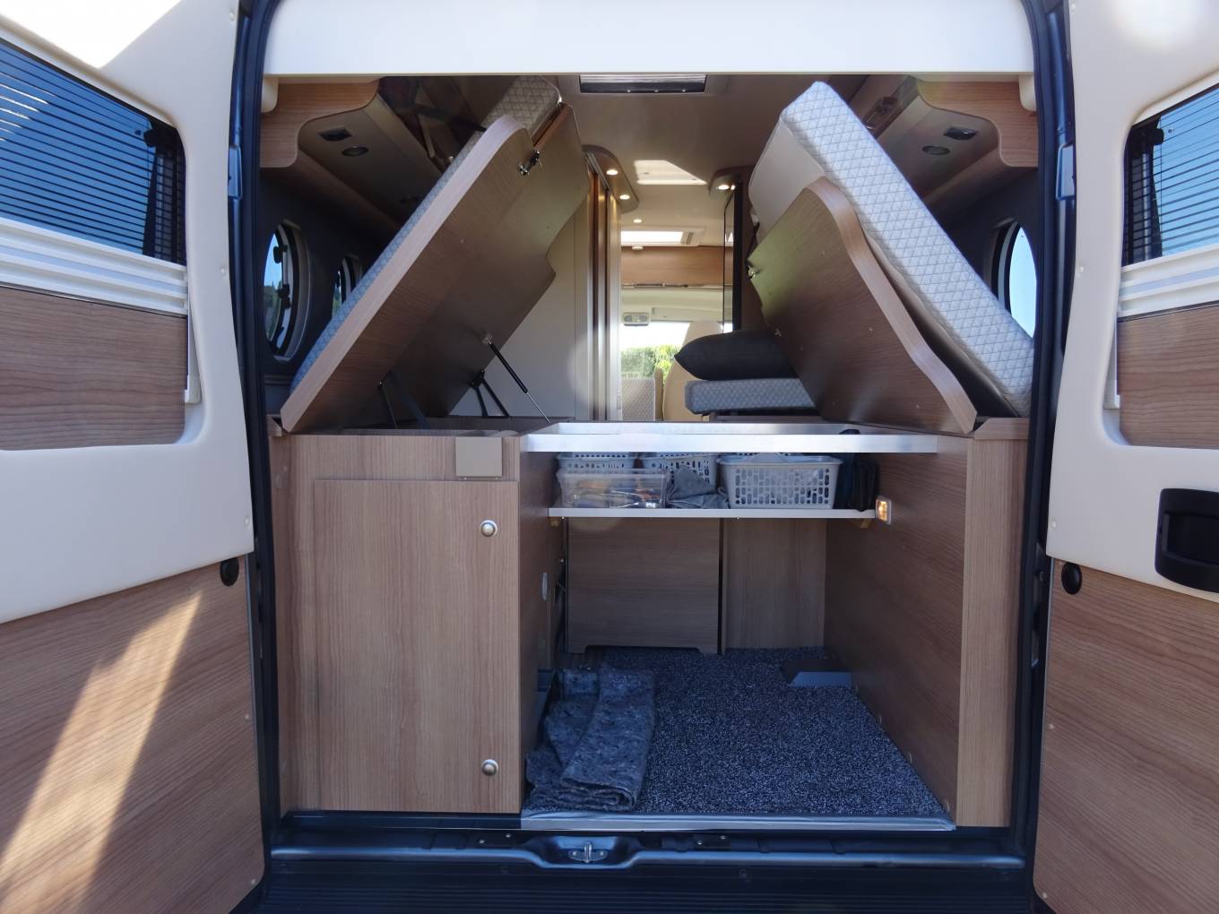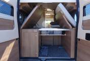 At the rear is the real stand out feature of this camper with its large bed and the amazing storage area. The bed can also be folded up on both sides whilst in transit to create enough space for mountain bikes and everything you will need for your adventures.