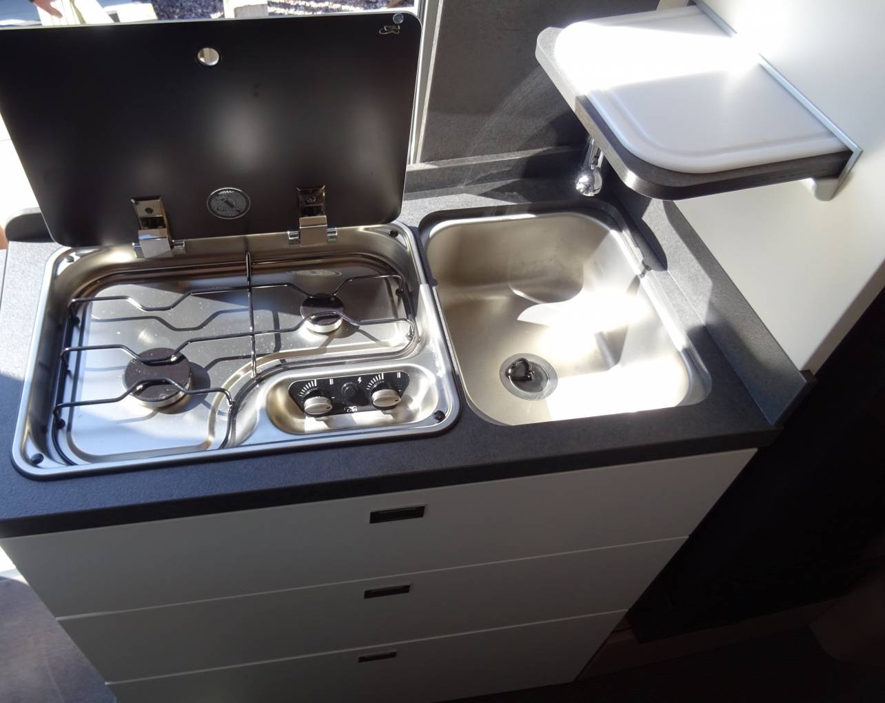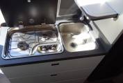 Mid ship we have the kitchen area featuring a 2 ring gas hob, sink