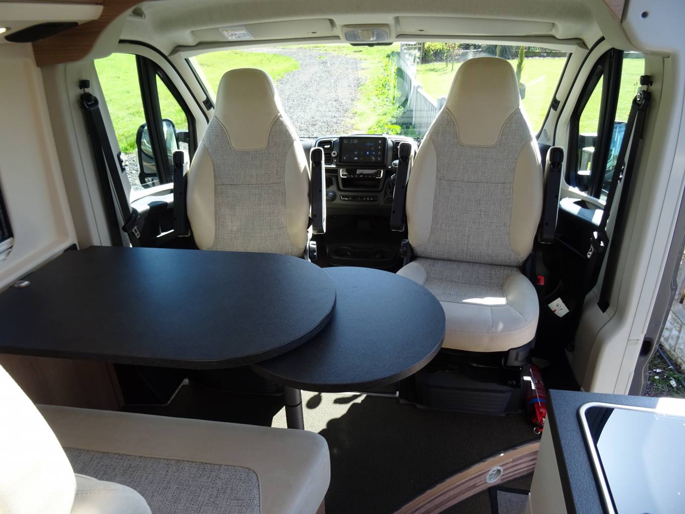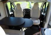 As you enter the camper into the central lounge area, with it's forward facing bench seat and the 2 front Captain seats, which swivel, all surrounding an extendable table, it creates a fantastic lounge/dining area to relax
