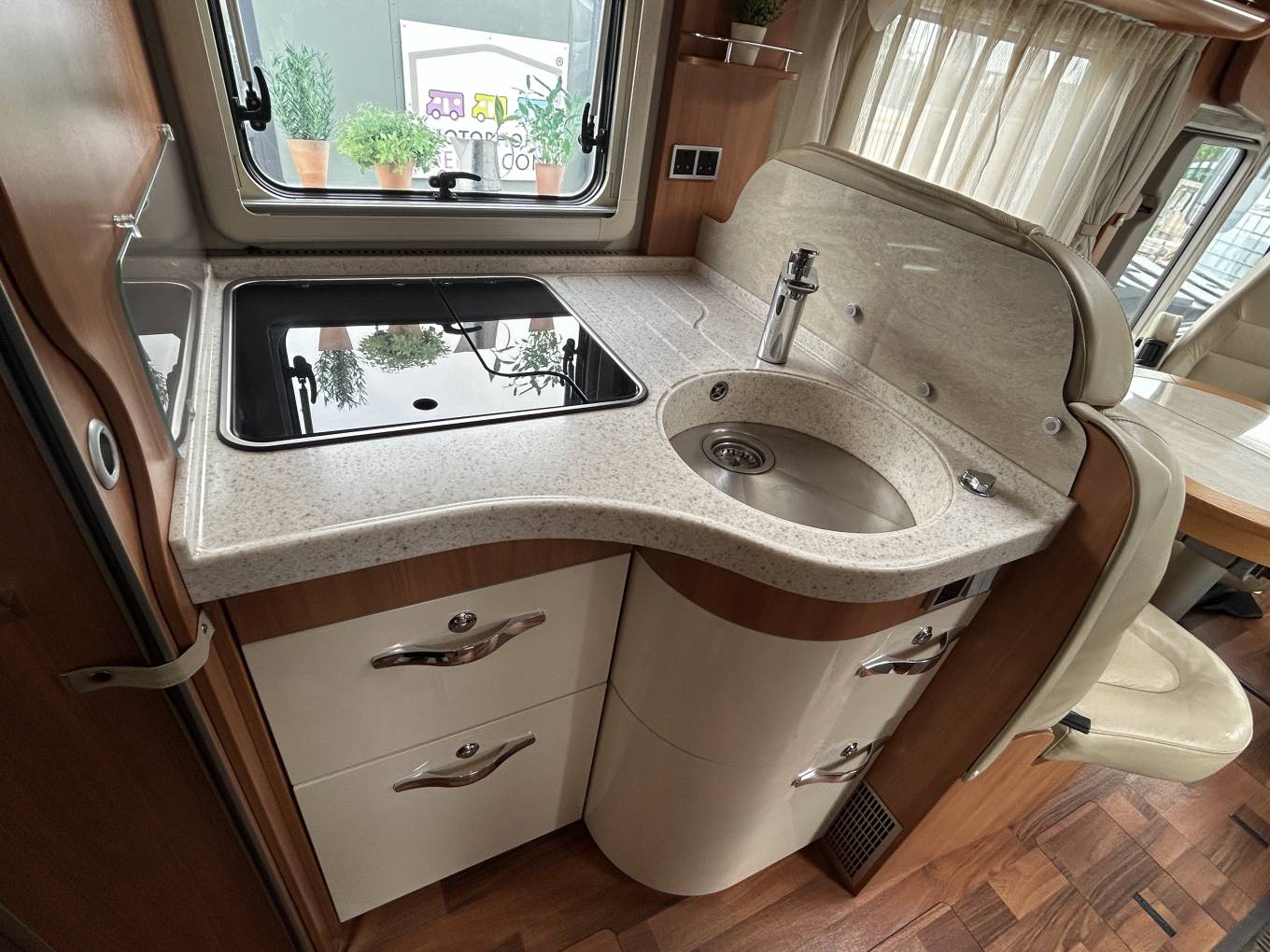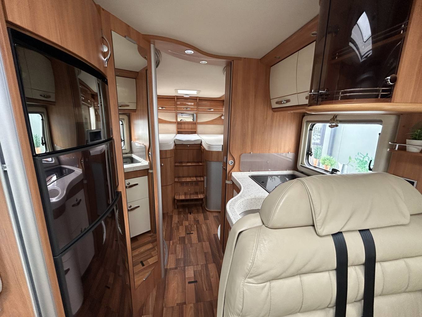 Inside, the layout is both luxurious and practical, featuring rear single beds that can convert into a large double with an infill, along with a front overcab drop-down bed, making it a comfortable 4-berth, 4-belt motorhome. The spacious lounge includes a centre dinette with additional travel belts, swivel seats with electric height adjustment, and a high-quality leather interior, complemented by electric blinds, removable carpets, speakers throughout and TVs (dinette and rear beds). The kitchen is fully equipped for extended touring, featuring a 3-burner gas hob, oven and grill, and a large fridge/freezer, alongside ample storage space. The washroom is equally impressive, offering a full washroom with separate shower room, delivering true home-from-home comfort.