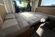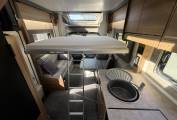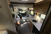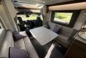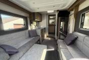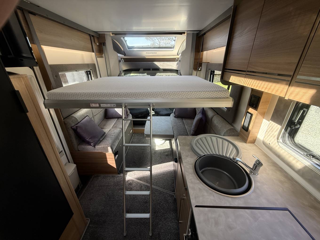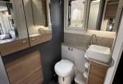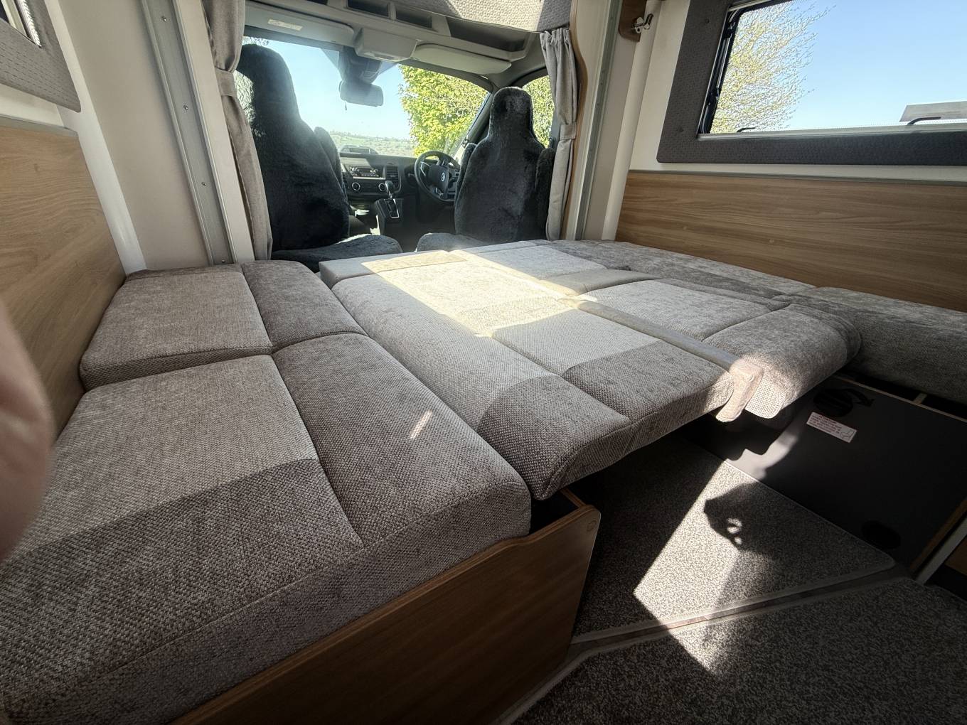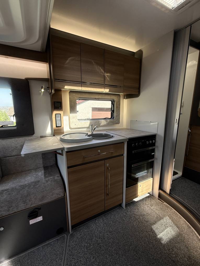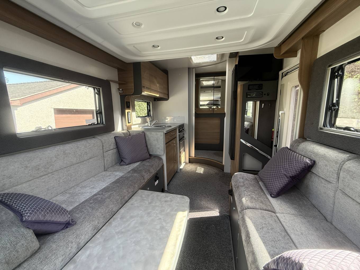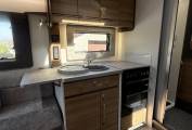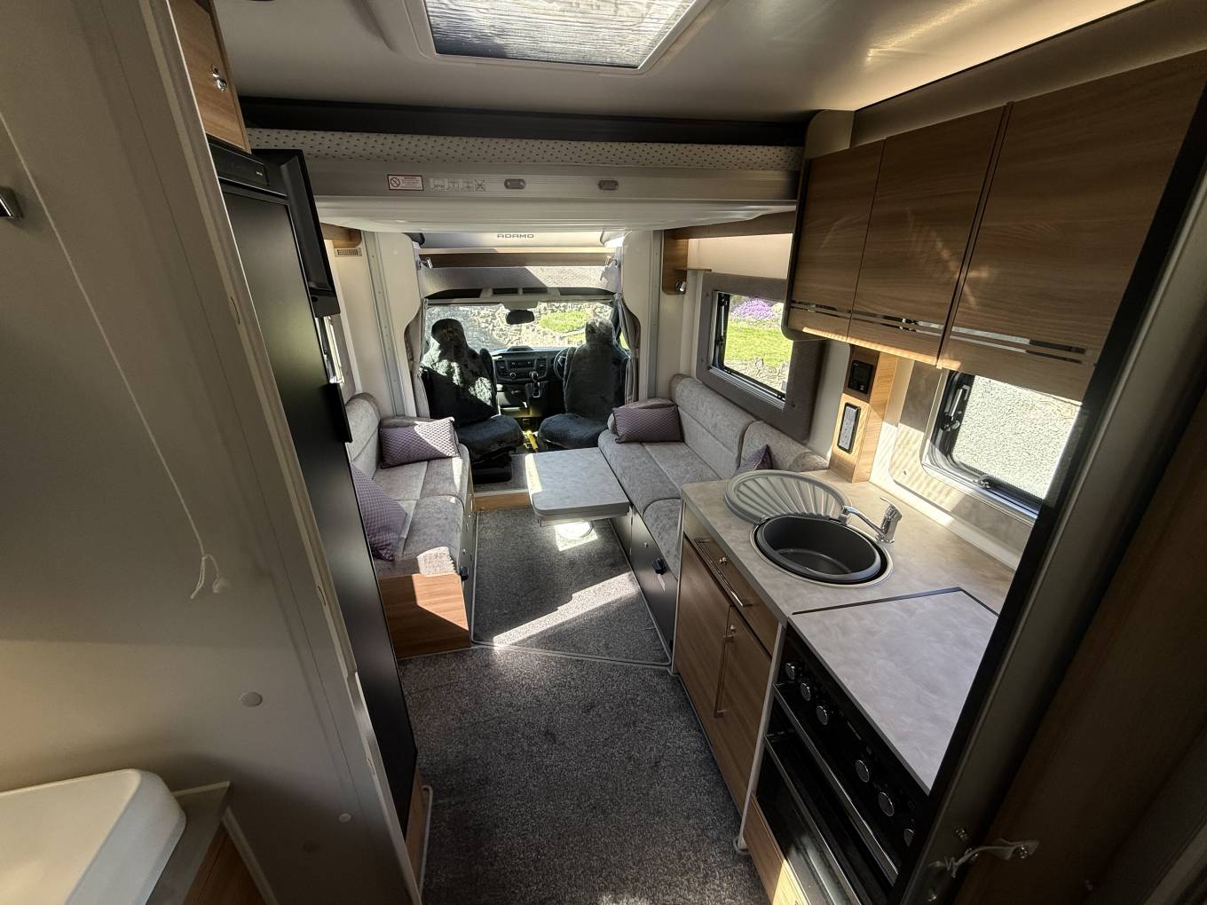 Open plan lounge with electric adjustable table that along with the two long side sofas and front driver and passenger seats can comfortably seat up to 6 people making this a great place to dine and entertain. The lounge can be converted to a large double bed for the 3rd and 4th berth or the two side sofas can be used as two single beds. A TV is provided and mounted to the corner point of the lounge area, by the main habitation door. The main bed is an electronically controlled drop down double with access ladder and is a good size and comes down to sit above the lounge. A well equipped kitchen includes extendable preparation area, 3 burner gas hob and electric hot plate, separate oven and grill, sink with mixer tap and a large 3 way fridge freezer. To the rear is a large washroom with home from home comforts. A flushing cassette toilet, wash basin with mixer tap, vanity mirror and storage and a separate shower cubicle along with large mirrored storage cupboard to the rear and access to the rear garage space.